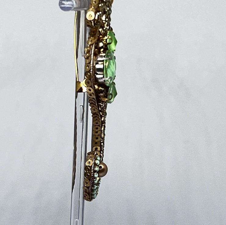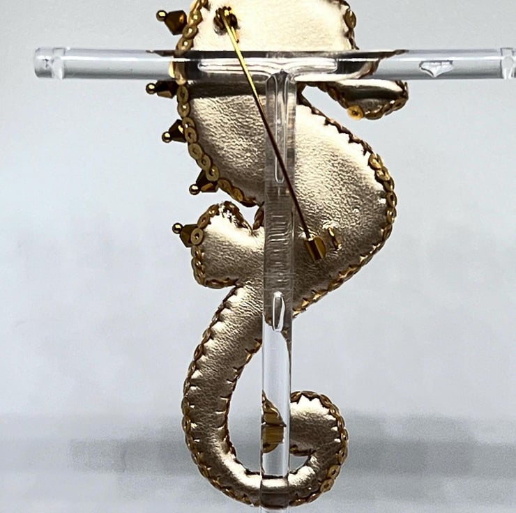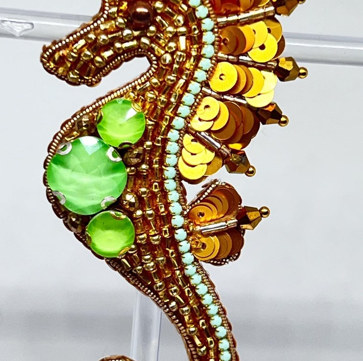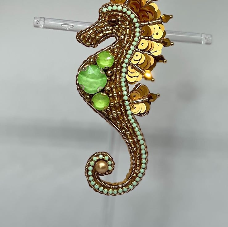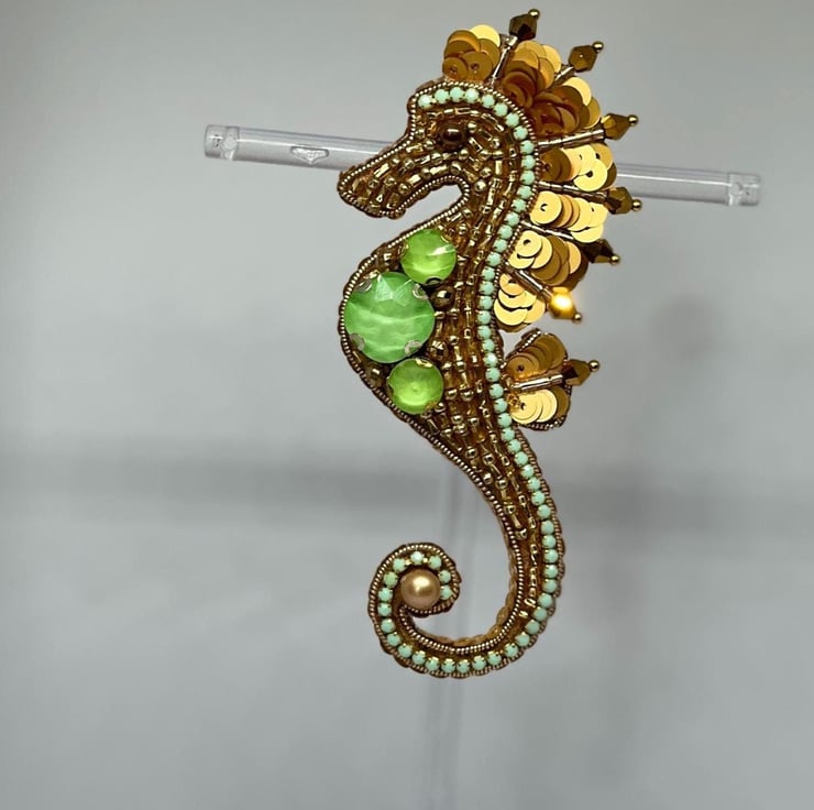 This handmade gold seahorse brooch is a stunning accessory for sea life enthusiasts. Adorned with vibrant green gems, intricate beads, and sequins, it reflects the beauty of the ocean. Perfect for adding a touch of elegance to your outfits or gifting to a loved one.