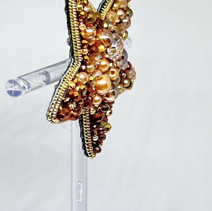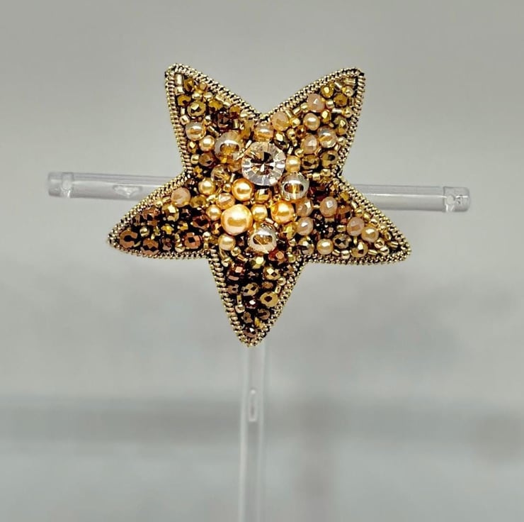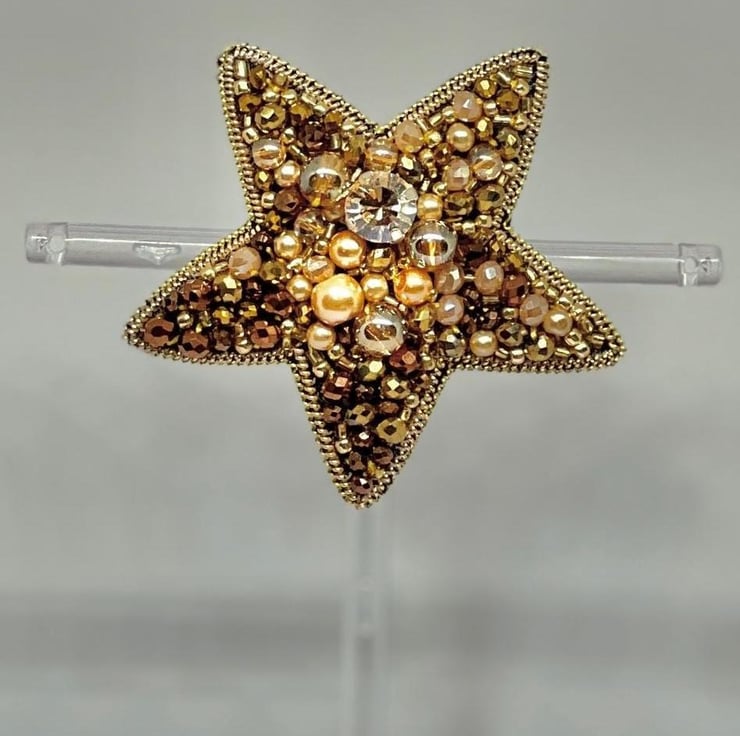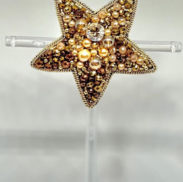 Elevate your style with this handmade golden star brooch. Beautifully crafted with shimmering crystals, pearls, and beads, this elegant accessory adds a touch of sophistication to any outfit. Perfect for formal events, celebrations, or as a unique gift for someone special.