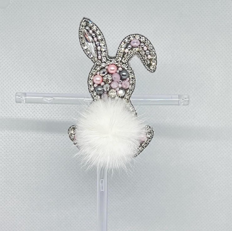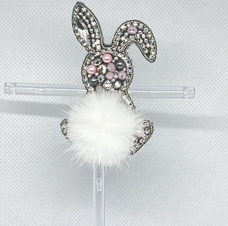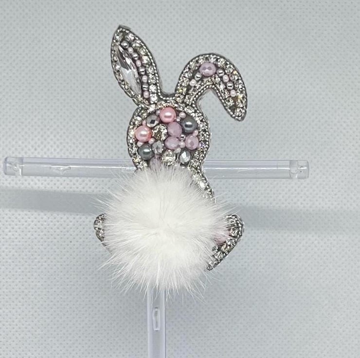 This handmade bunny brooch features intricate beadwork with sparkling crystals and pearls, complemented by a soft faux fur tail. Perfect for adding a playful yet elegant touch to jackets, bags, or hats. A thoughtful gift for Easter, birthdays, or any special occasion.
