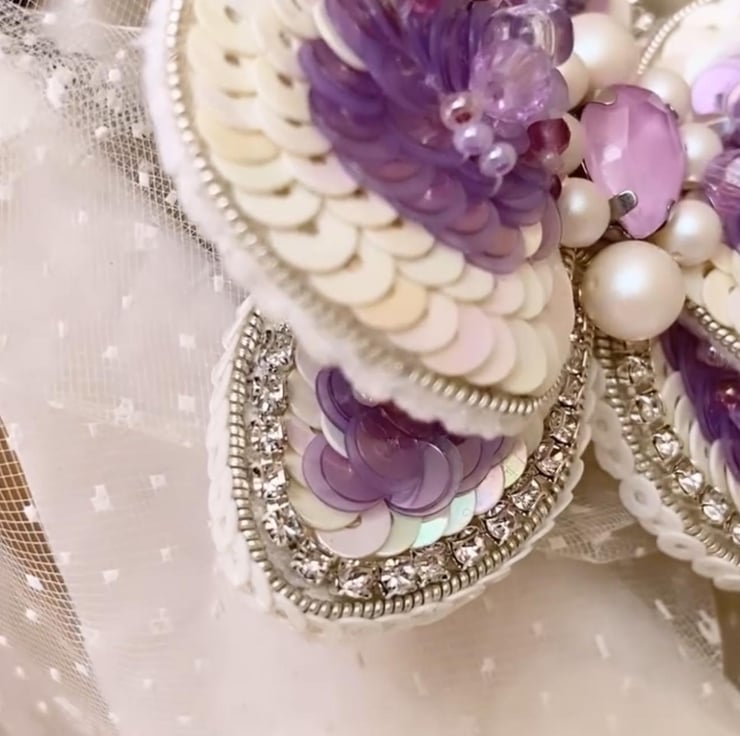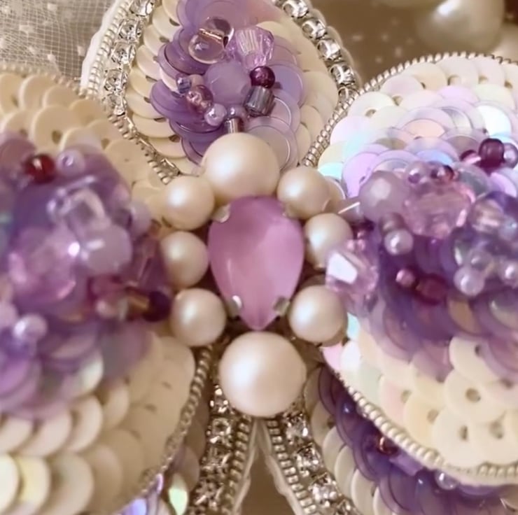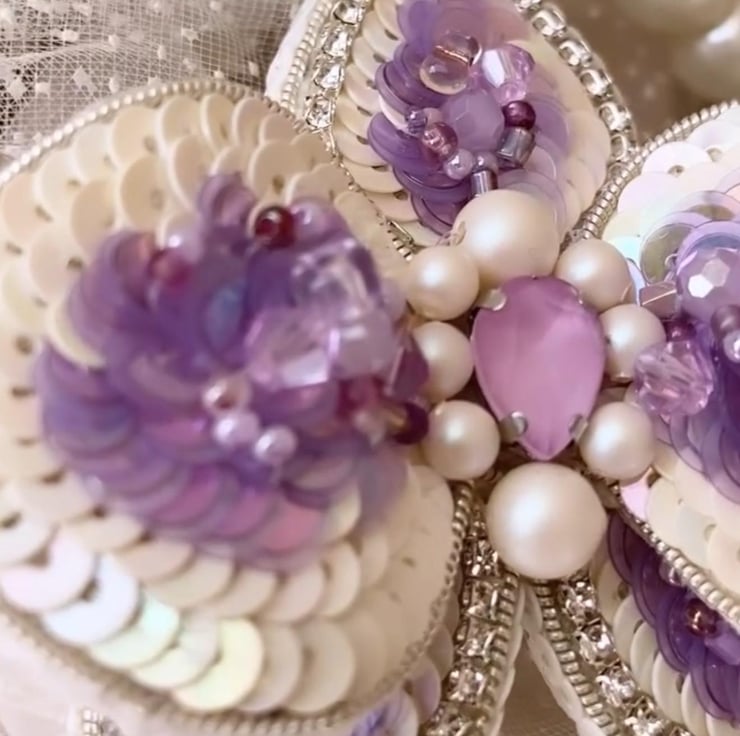 Sequins, beads, pearls, rhinestones, wire, backing fabric, brooch pin.