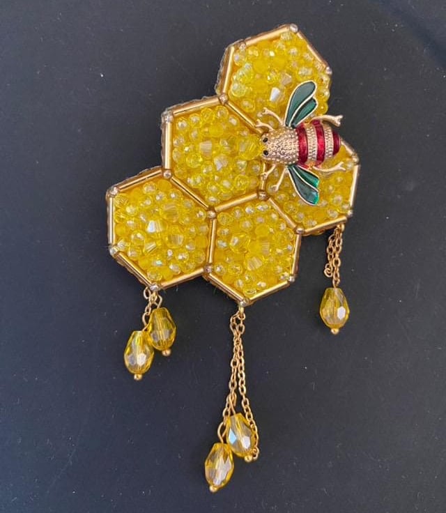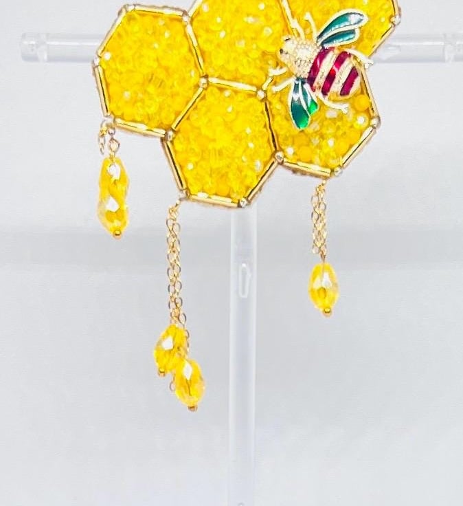 This handmade honeycomb bee brooch is a stunning accessory inspired by nature. Crafted with sparkling yellow beads and a detailed bee design, this brooch adds a vibrant touch to your outfit. Its dangling yellow crystals enhance its charm, making it perfect for jackets, scarves, and hats. Ideal as a unique gift for nature enthusiasts, bee lovers, or as a statement piece for yourself. Made with high-quality beads, crystals, and metal accents, this brooch symbolizes the beauty of nature and the importance of bees.
