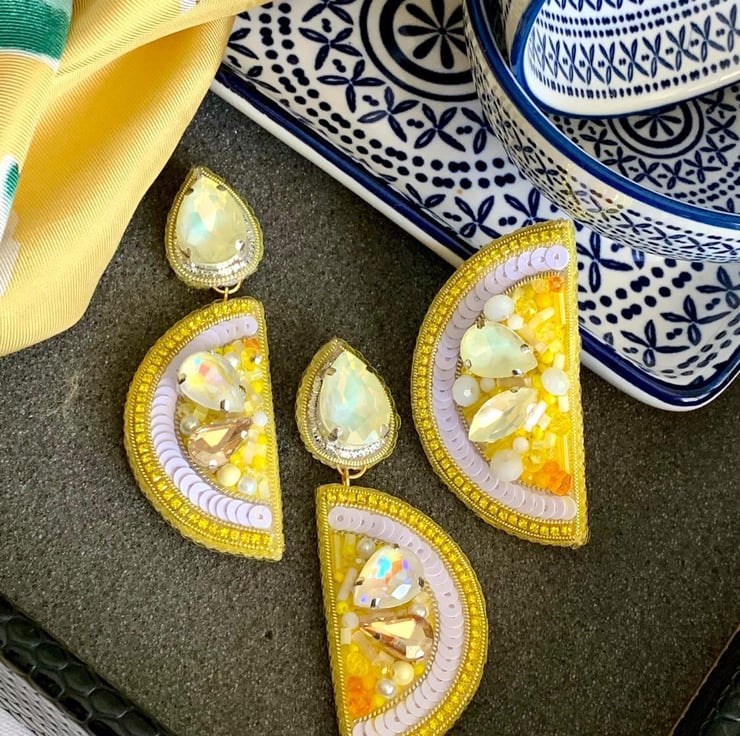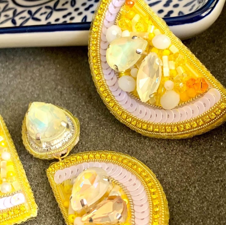 This exquisite handmade brooch and earrings set is a perfect blend of yellow and pastel tones, featuring sequins, beads, and crystal embellishments. The set is crafted with precision and care, making it ideal for weddings, parties, or gifting. The brooch adds a touch of sophistication to any outfit, while the matching earrings complete your look with elegance. Lightweight and durable, this set is designed for both comfort and style. Perfect for fashion enthusiasts and a thoughtful gift for loved ones.