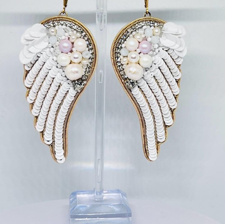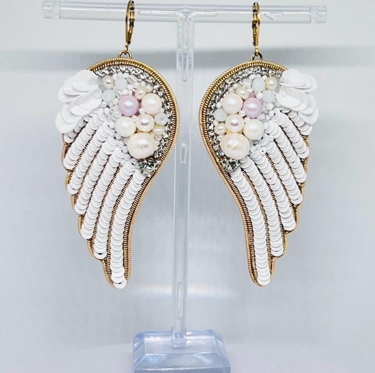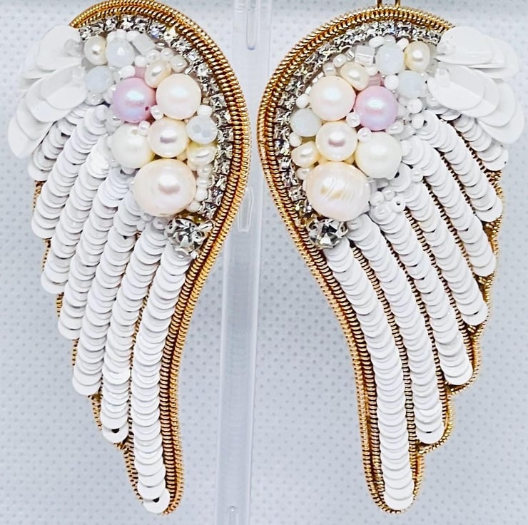 Delicate handmade angel wing earrings crafted with shimmering sequins, lustrous pearls, and dazzling crystals. These lightweight earrings are perfect for weddings, formal events, and as unique gifts. Their ethereal design symbolizes grace and elegance. A stunning accessory to elevate any outfit, these earrings are a true work of art, designed for comfort and style.
