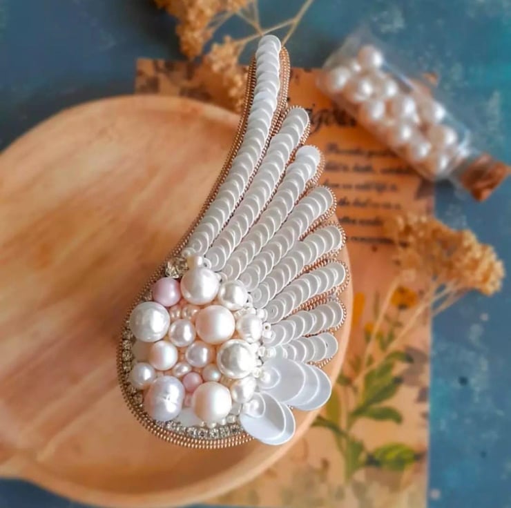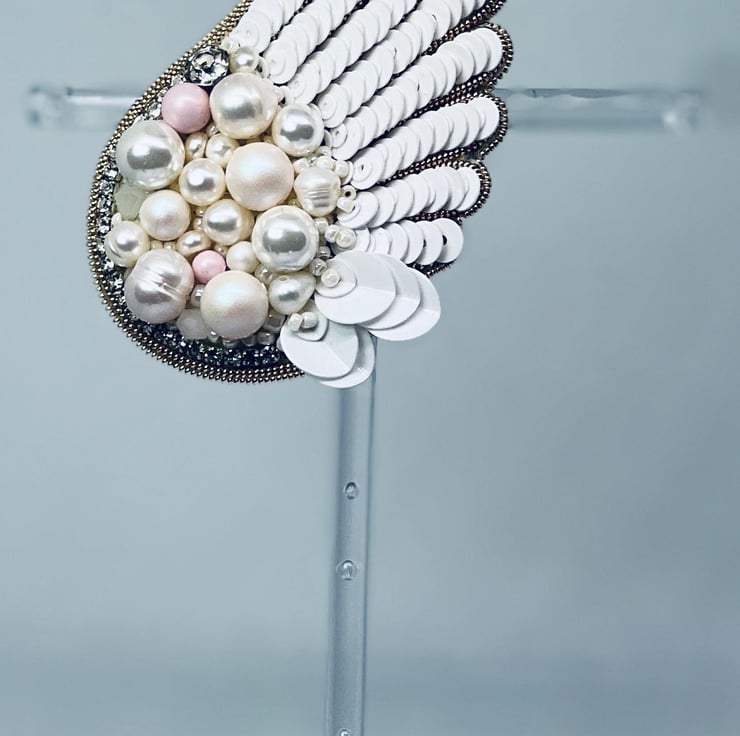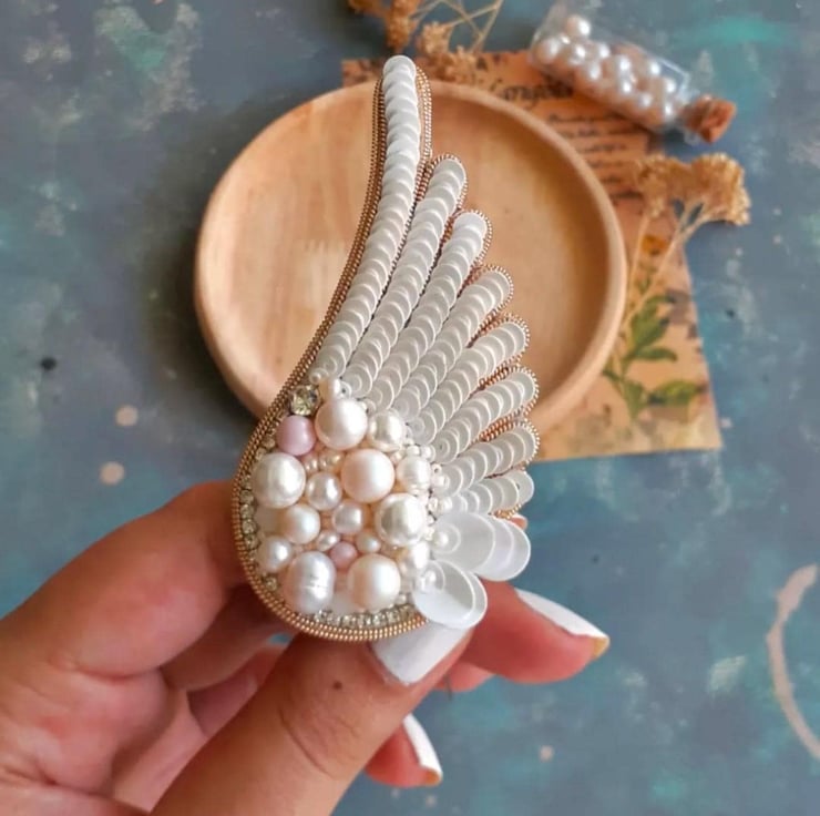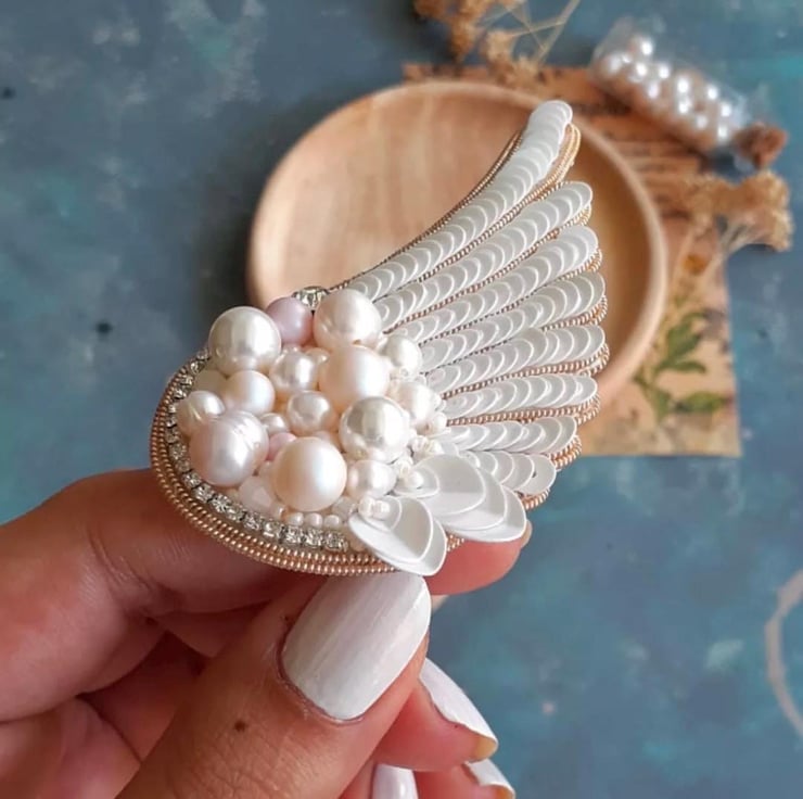 This angel wing pearl brooch is a stunning handmade piece of wearable art. Crafted with intricate detailing, it features lustrous pearls, shimmering sequins, and a soft blend of materials to create a heavenly design. The brooch measures approximately insert size and is perfect for enhancing your outfit, whether worn on a lapel, dress, scarf, or handbag. Ideal as a gift for someone special, this angel wing brooch symbolizes protection and grace. Great for weddings, religious ceremonies, or everyday elegance. Handcrafted with love for timeless beauty.