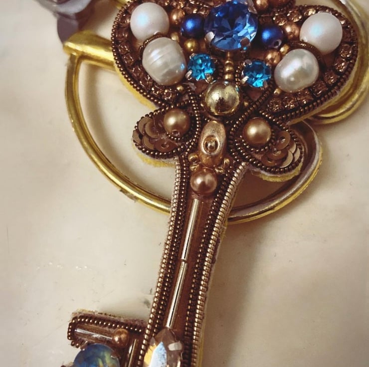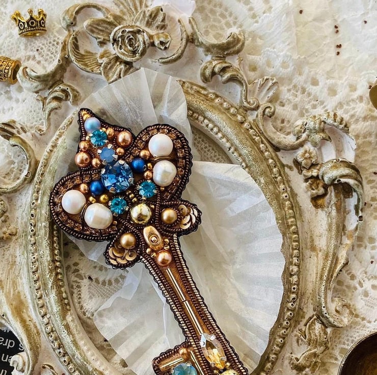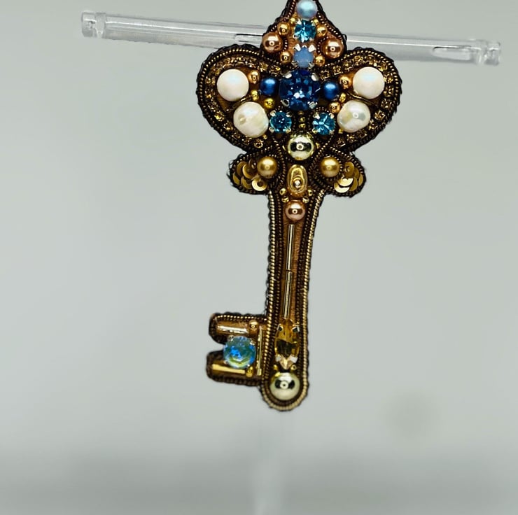 This handmade beaded key brooch features an intricate design adorned with pearls, crystals, and metallic beads, creating a vintage-inspired statement piece. Perfect for accessorizing coats, scarves, hats, or bags, this brooch adds a royal and elegant touch to any outfit. A unique gift idea for women who appreciate intricate craftsmanship and timeless designs. Lightweight and easy to pin, it s suitable for both casual and formal occasions, making it a versatile accessory.