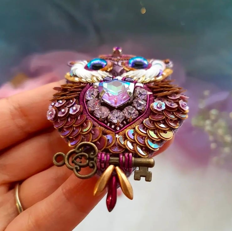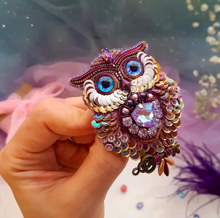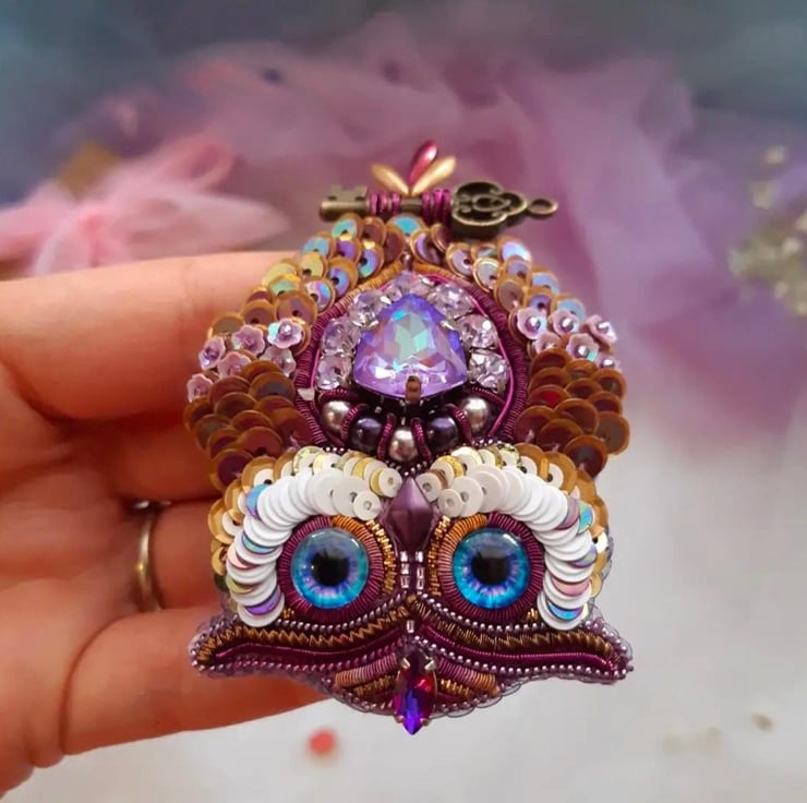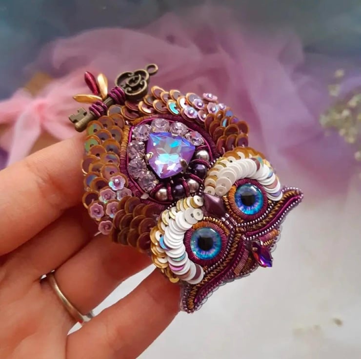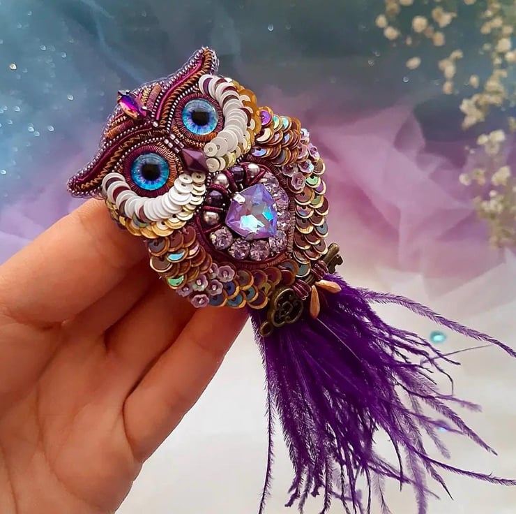 This stunning handmade purple owl brooch combines intricate beadwork, a detachable feather detail via magnet, and a vintage-style key charm. Designed to add elegance and whimsy to your outfits, it can be worn with or without the feather attachment. A unique gift or accessory, this brooch suits all occasions formal, casual, or festive. Crafted with attention to detail, it features high-quality materials for durability and style. Perfect for pinning to jackets, scarves, bags, or as a statement jewellery piece. Embrace artistry with this charming owl brooch.