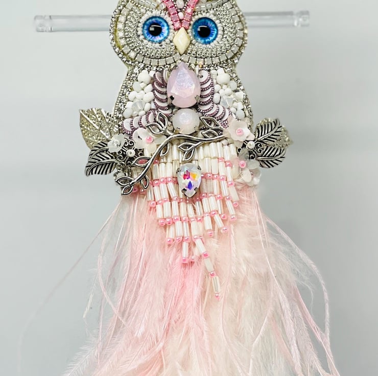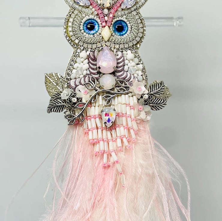This beautiful handmade pink owl brooch is intricately beaded with crystals, pearls, and feathers, creating a whimsical design. Perfect for nature lovers, owl enthusiasts, or anyone seeking a unique statement piece. This lightweight brooch adds charm to any outfit, making it a thoughtful gift for birthdays, anniversaries, or special occasions.