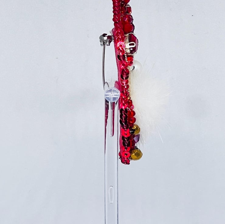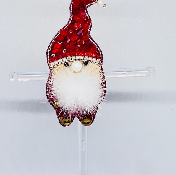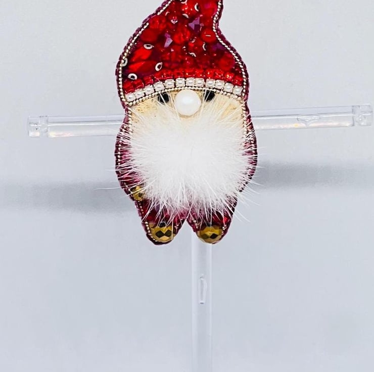 Add a touch of holiday cheer to your outfit with this Handmade Christmas Gnome Brooch. Beautifully crafted with sparkling red beads, pearls, and a soft faux fur beard, this brooch makes the perfect festive accessory. Lightweight and versatile, it s ideal for pinning to coats, scarves, hats, or bags, making it a delightful gift for friends, family, or yourself. Celebrate the season with a charming handcrafted pin that embodies Christmas spirit.