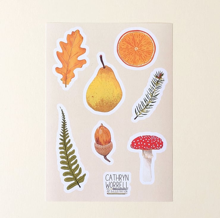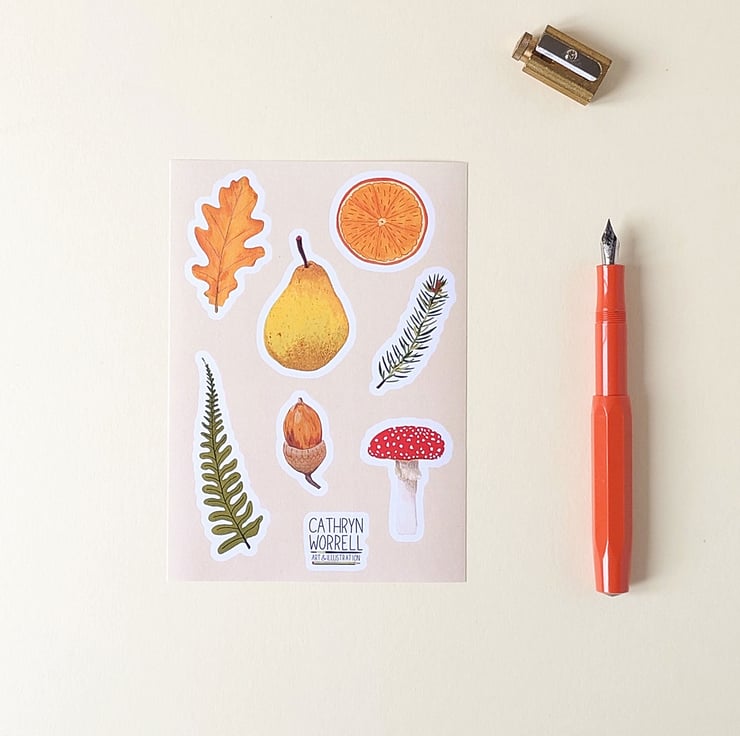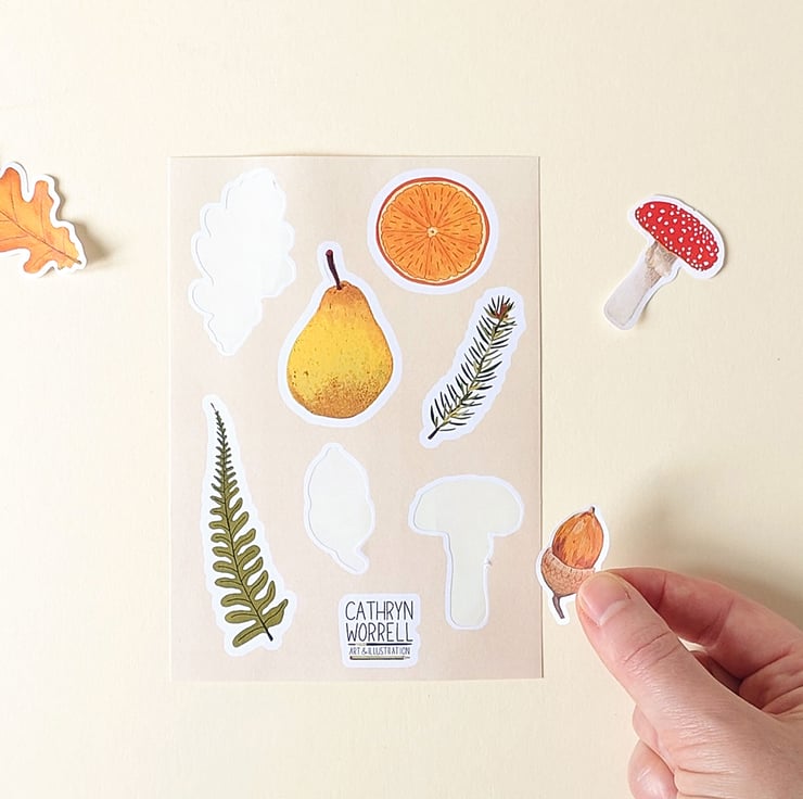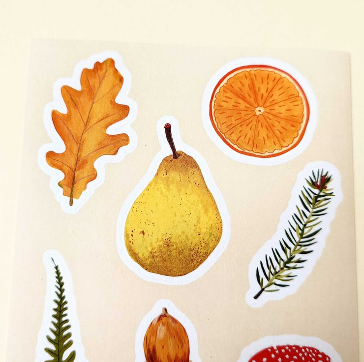 One sticker sheet featuring my autumnal forest illustrations inspired by woodland walks and cosy fall days.
