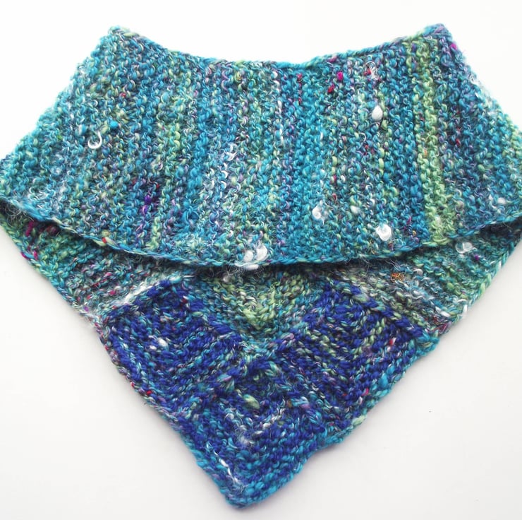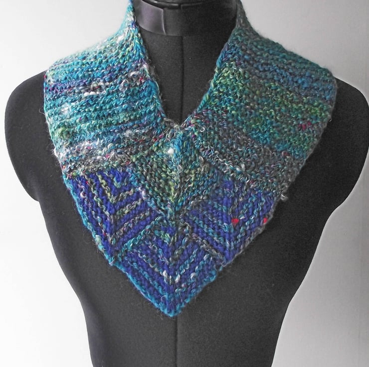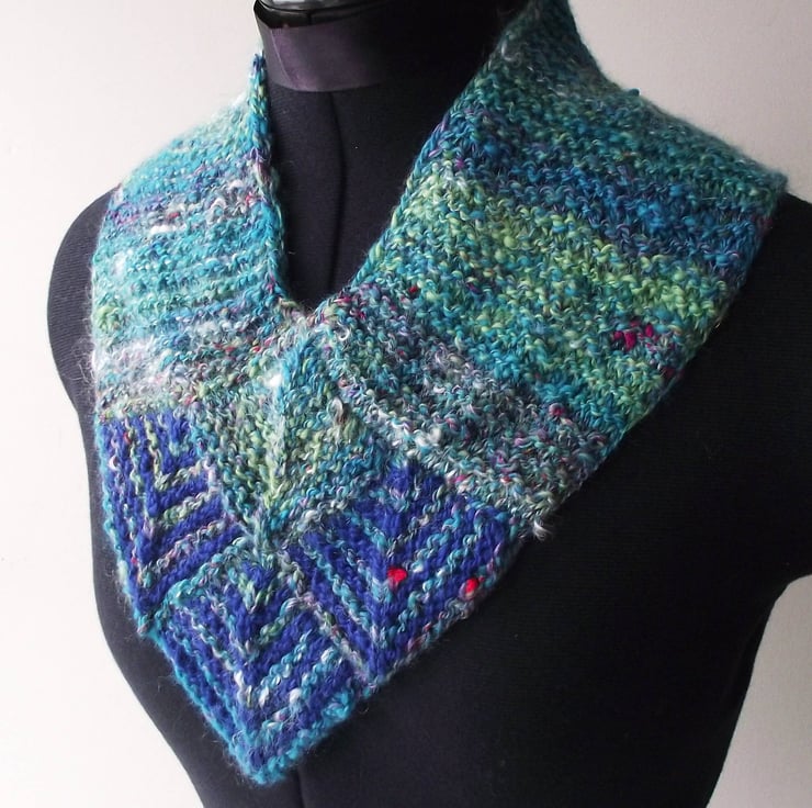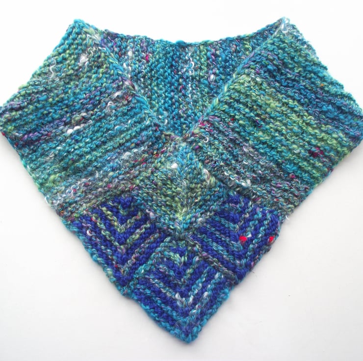 I blended several shades of merino wool with some recycled sari silk, purple tussah silk and kid angora. I then handspun this blend into a unique, medium weight 'art yarn'. I also spun some ultramarine blue merino wool, then knitted this neckwarmer or scarf using the modular Domino technique with four mitred squares at the front, continuing around the neck with a garter stitch section just in the art yarn.