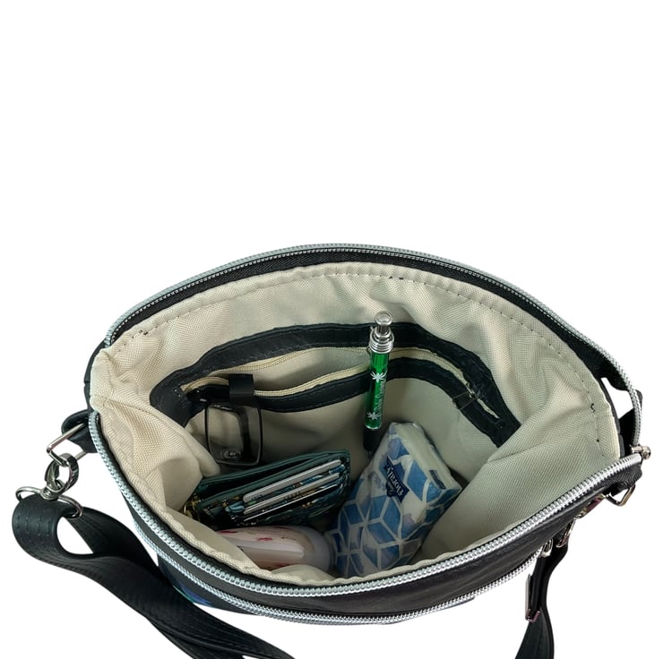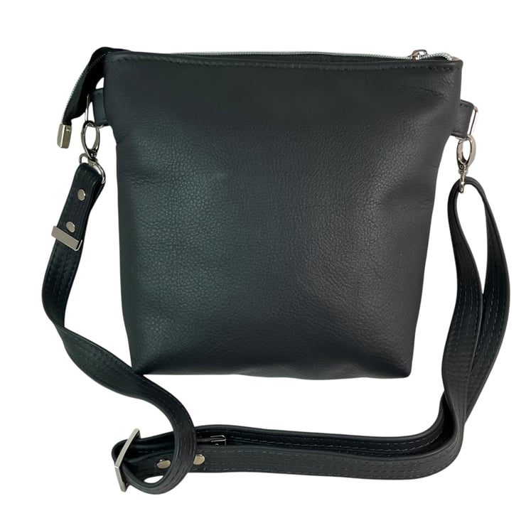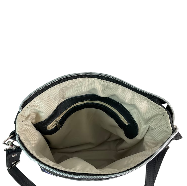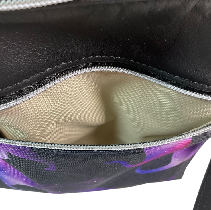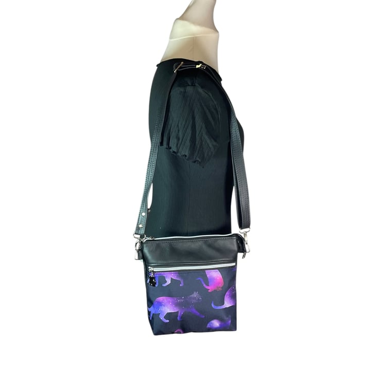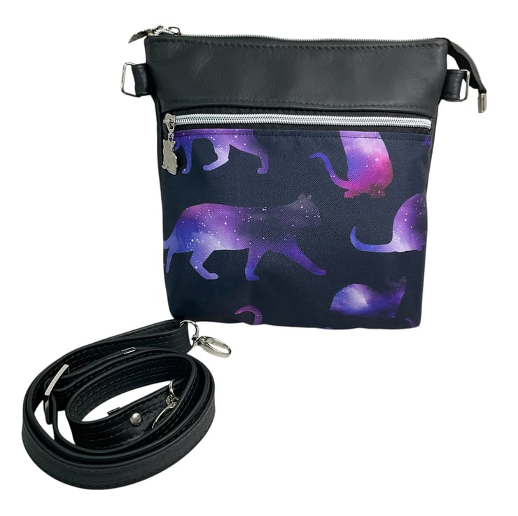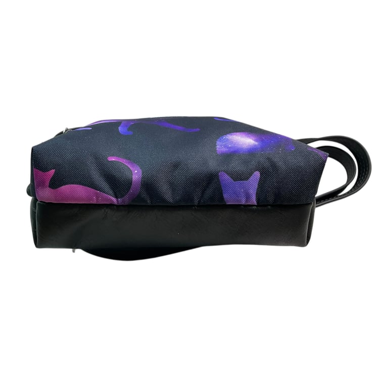 This handy sized bag is made of medium thickness cows leather in black. It has been paired with a front pocket made in water resistant canvas that features space dyed tonal cats in purple.