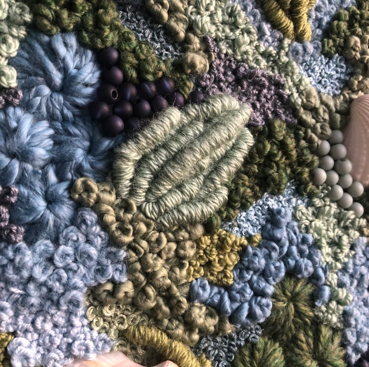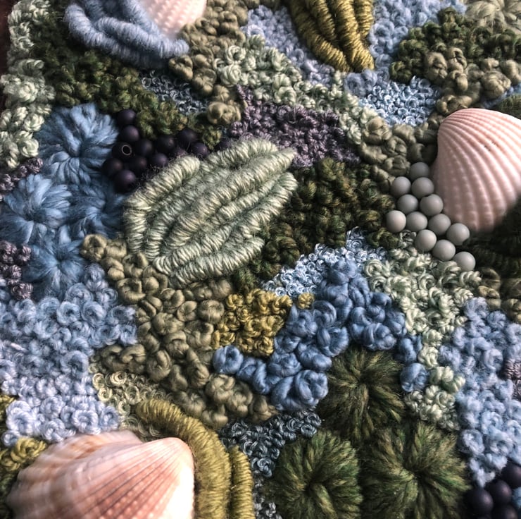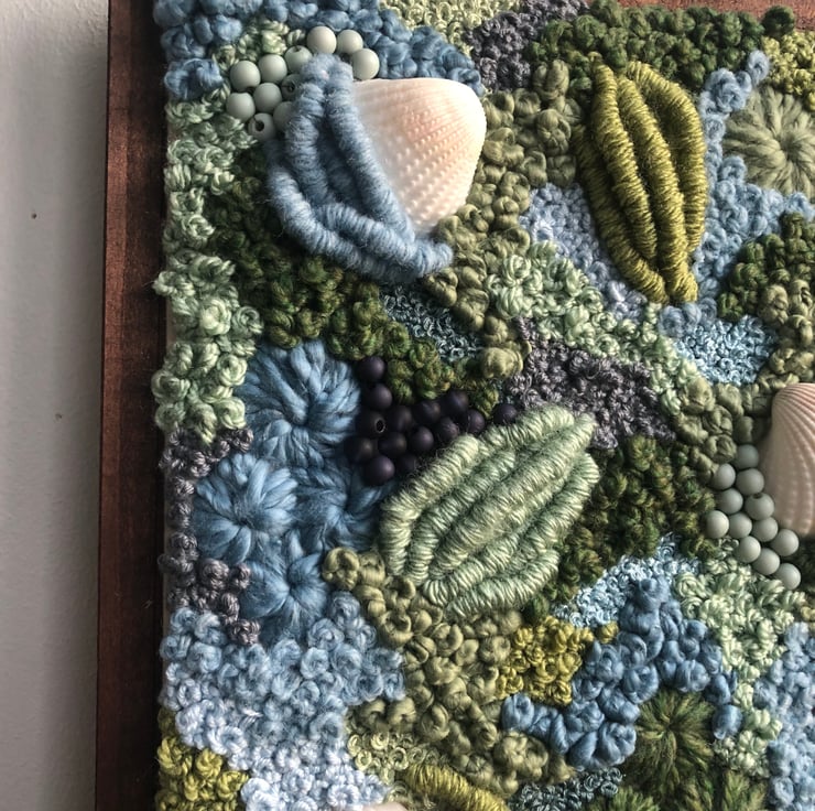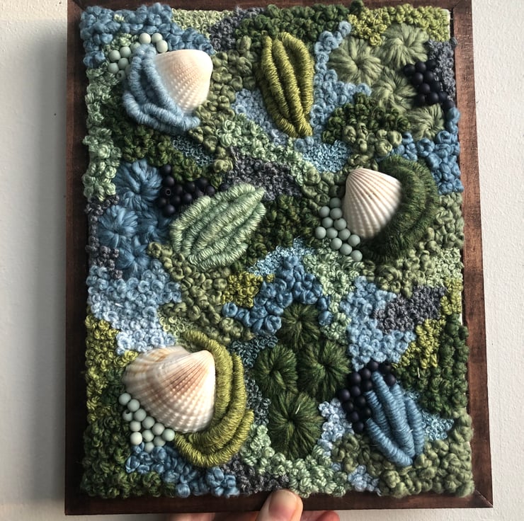 Infinite tides a 10x8 inch one of a kind framed canvas art piece. Embroidery thread, yarn, beads and shell have been hand stitched into a beige fabric in an abstract pattern. This has created a piece of art which is both eye catching and unique the perfect addition to any home.