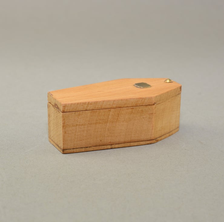 Inspired by an antique Georgian Momento Mori snuffbox. Hand made by me from salvaged pine wood and adorned with a salvaged antique brass nameplate. 7cms long, 3.3cms wide and 2.5cms tall.
