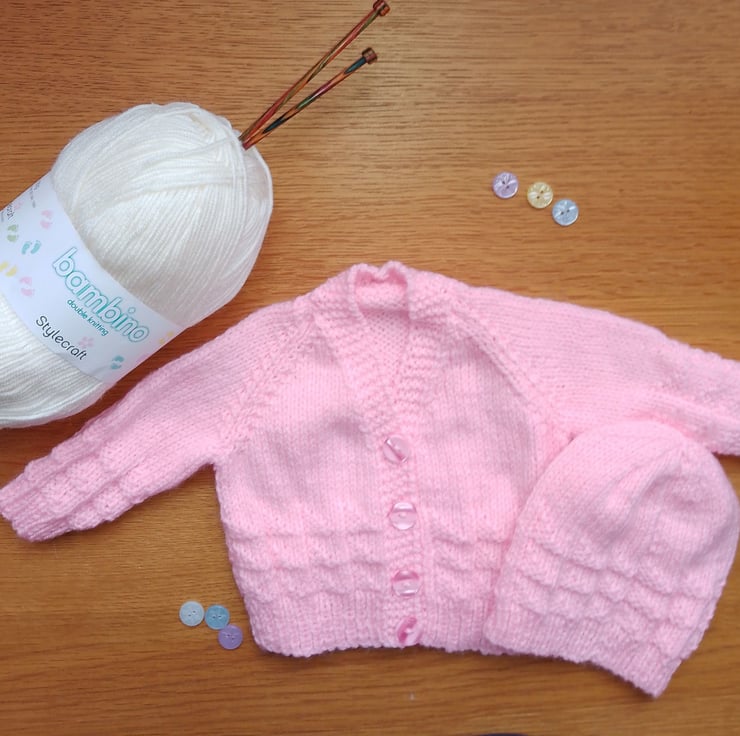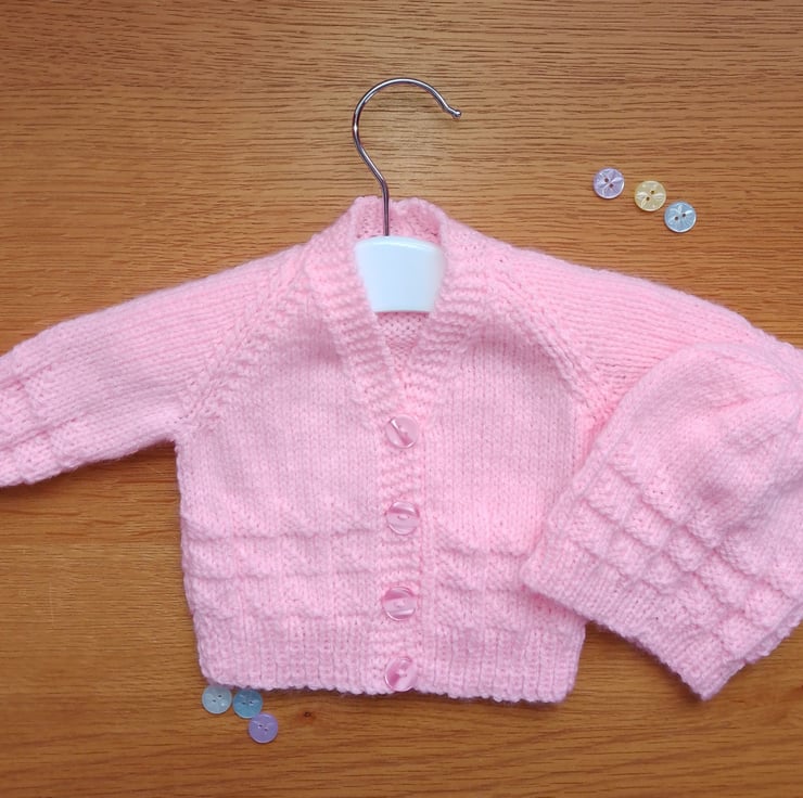 Hand Knitted Traditional Baby Cardigan and Hat Set