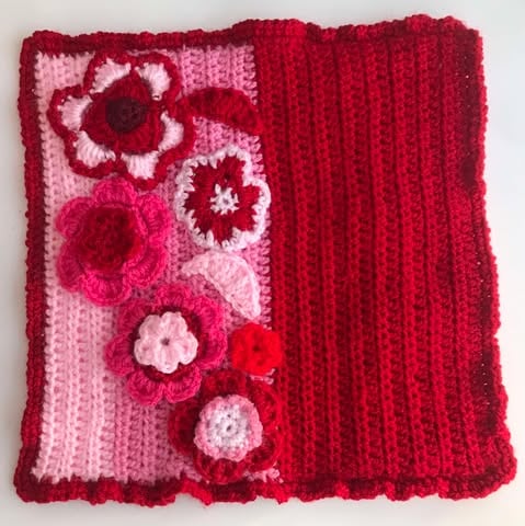 Home Decor cushion case red-pink handmade crocheted with floral ornaments added as a Mother's Day or St Valentine's gift. Not only.