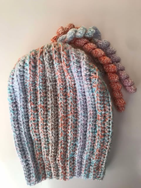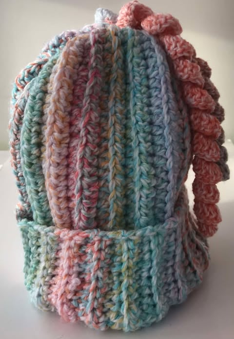 Handmade crocheted ribbed adult hat, hard wearing. Stretchable due to crocheted pattern and acrylic yarn. Size 22-inch circumference head, Length 11 inch. Three " tentacles" were added, not detachable.