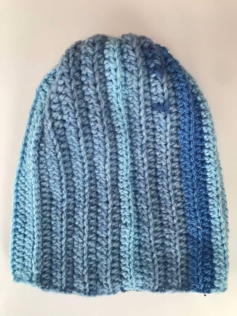 Handmade crocheted ribbed children's hat, hard wearing. Stretchable due to crocheted pattern and acrylic yarn. Size 18-inch circumference head, Length 9 inches. Children size.