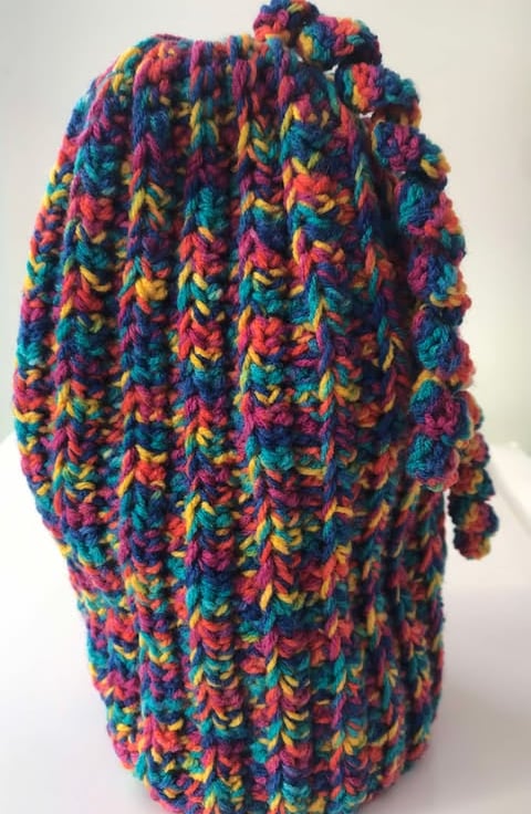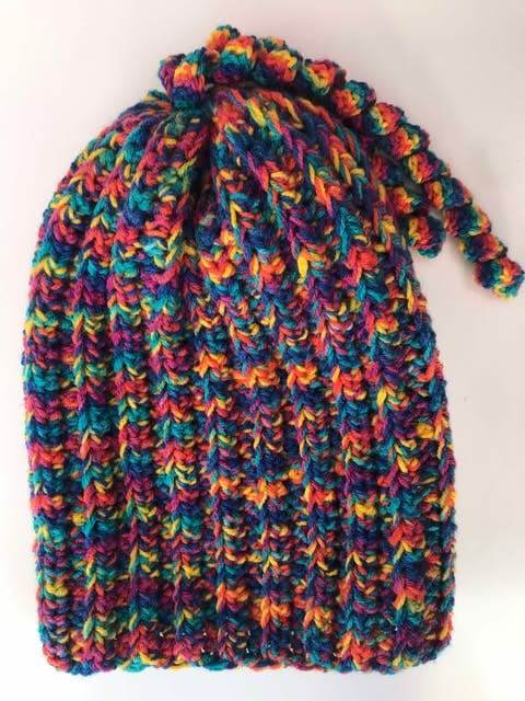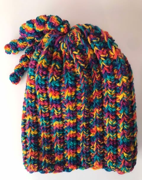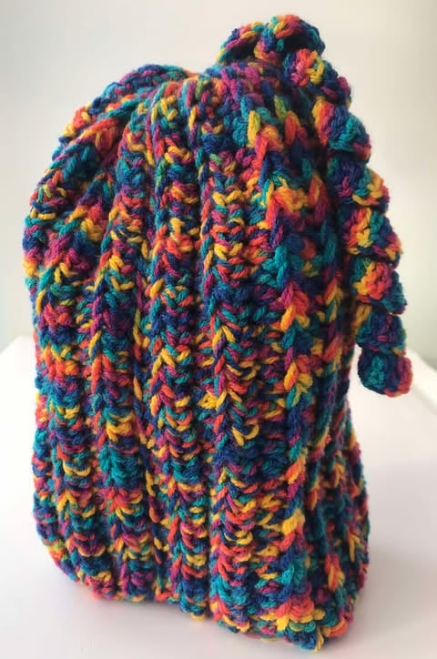 Handmade crocheted ribbed hat, hard wearing. Stretchable due to crocheted pattern and acrylic yarn.