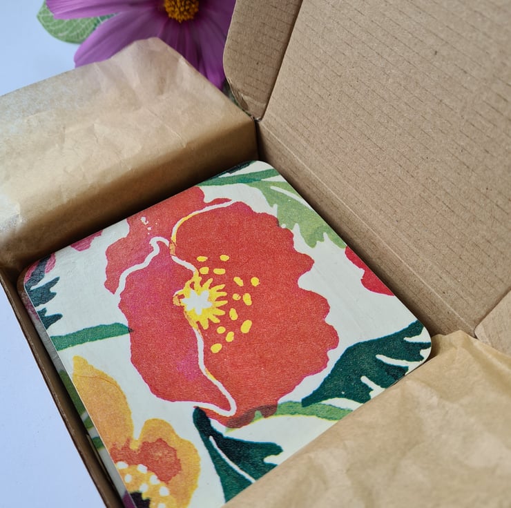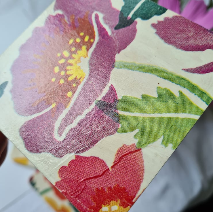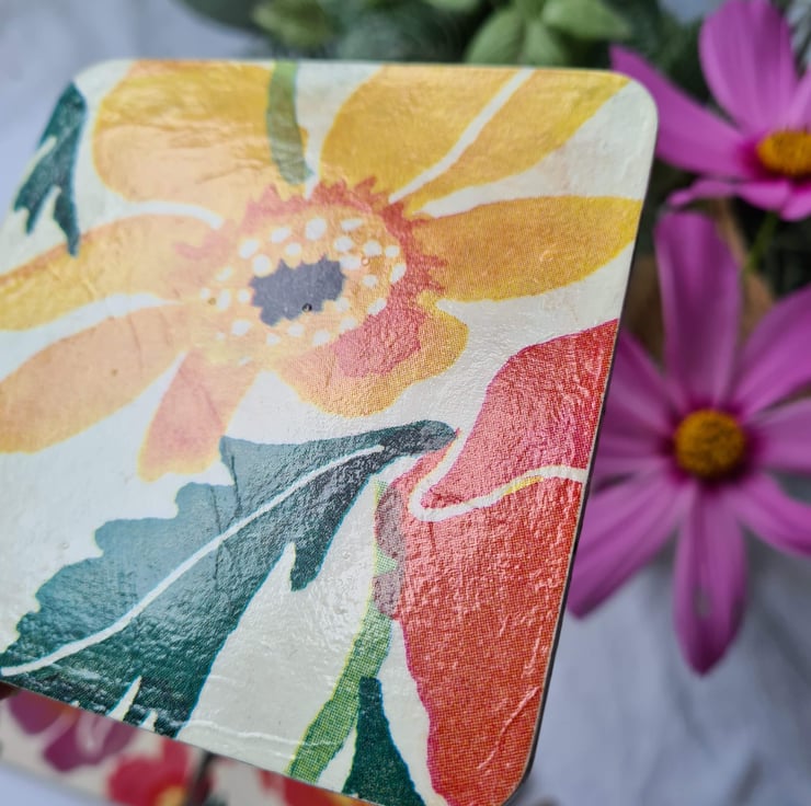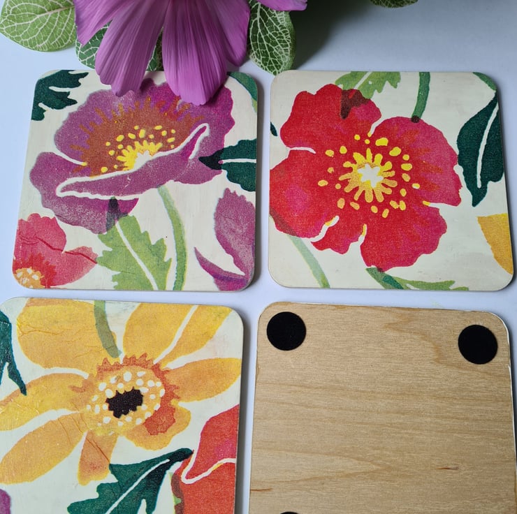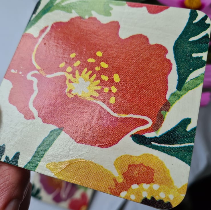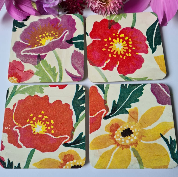 This set of four pretty wooden coasters has been decorated using decoupage with Emma Bridgewater Cosmos and Poppies design paper napkins. Each coaster has a different flower design, making a lovely colourful set. This beautiful design would look great with any decor and add colour and charm to the table. They would make a lovely housewarming gift, or for Christmas or secret santa.