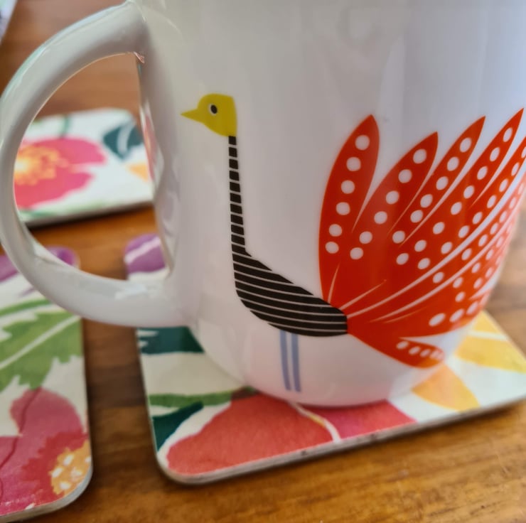 As they have been decorated by hand there are some imperfections, e.g. the paper is wrinkled in parts. This does not affect the use of them and is reflected in the sale price. The coasters are made from birch plywood and each one measures 9.5x9.5cm and approx 4mm high including the felt pads on the bottom, which will protect furniture.