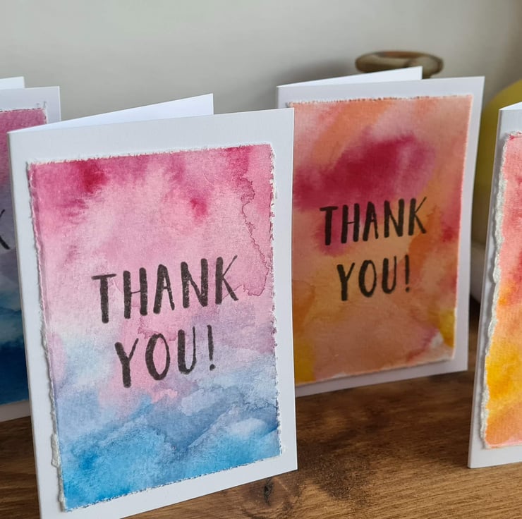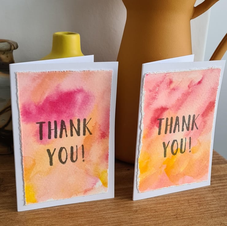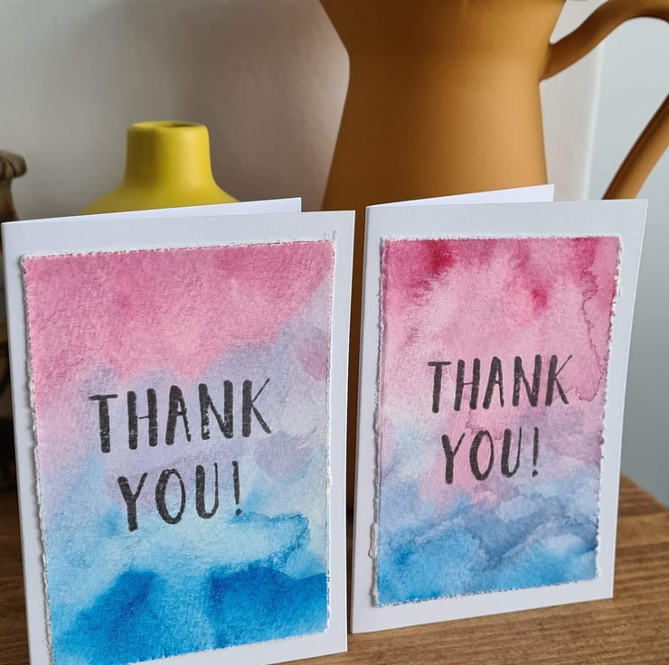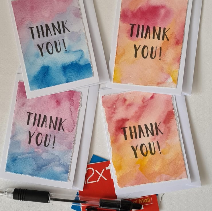 Pack of four notecards, all handpainted on quality watercolour paper which is attached to the card and stamped with a 'thank you' message. There are two of each colourway - pink/blue and yellow/red.