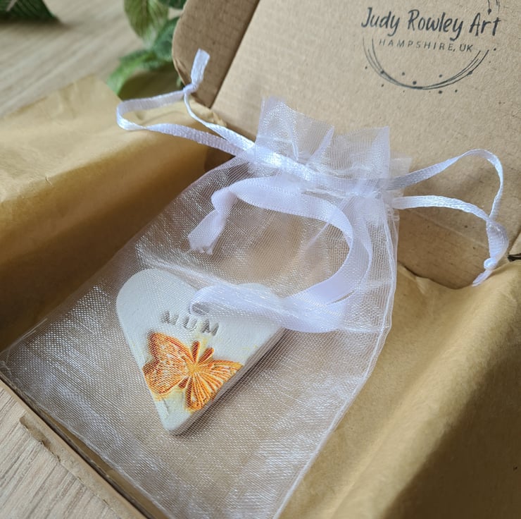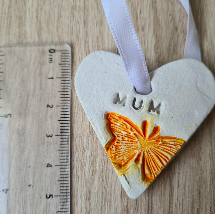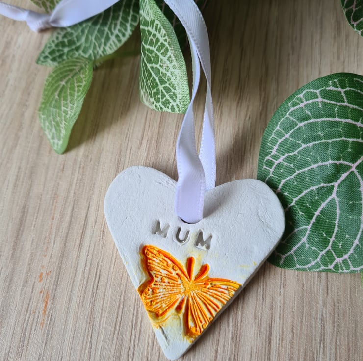 This pretty heart shaped Mother's Day hanging decoration is made from air-drying clay, with the word 'mum' stamped into the clay and embossed with a butterfly. I have painted the butterfly with a colourwash and varnished the decoration before finishing with ribbon.