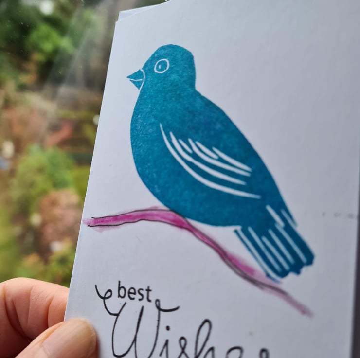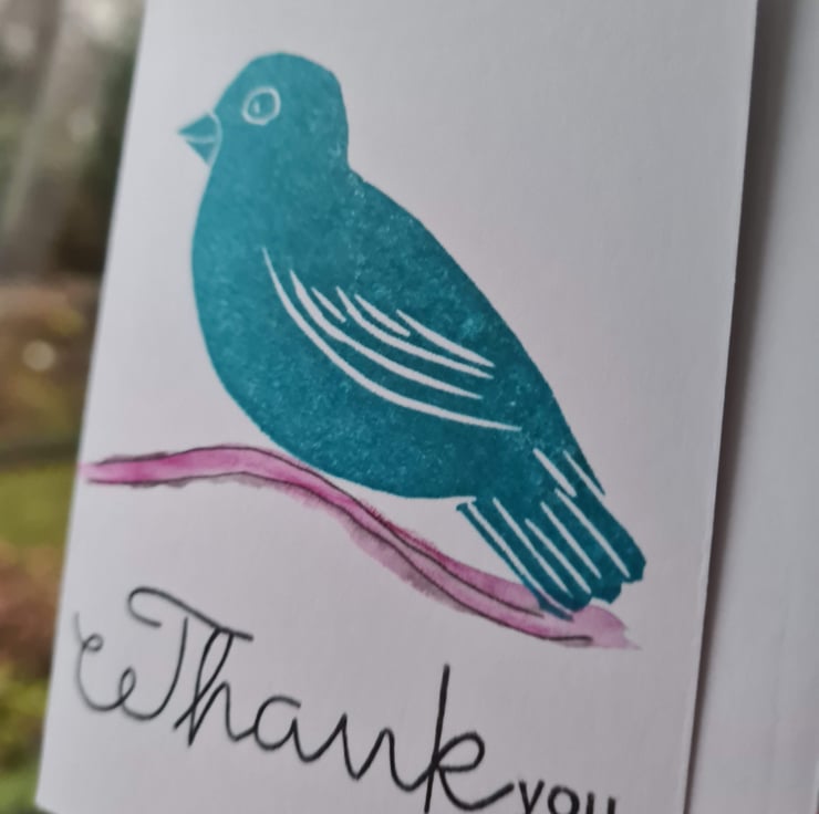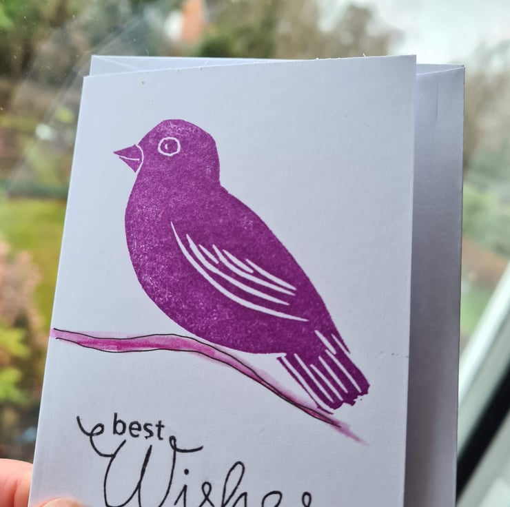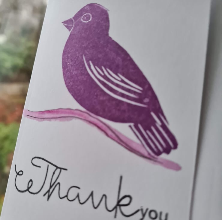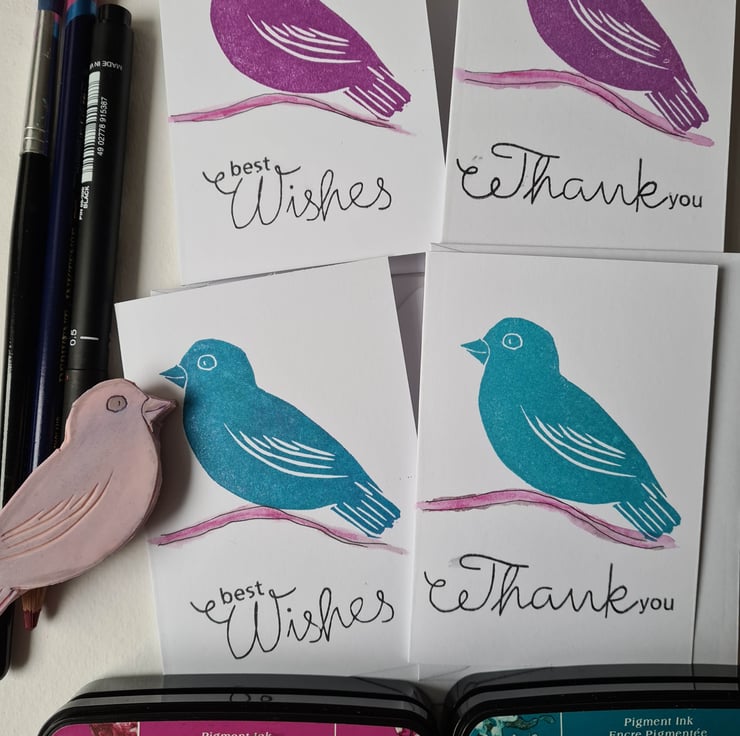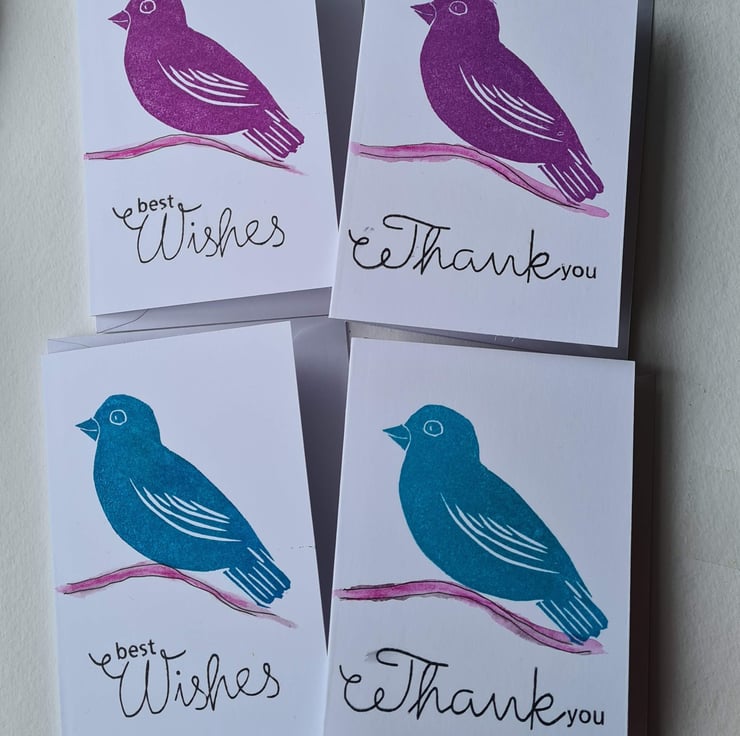 Pack of four cards - two 'thank you' and two 'best wishes'; two purple and two blue - all handprinted using a rubber stamp of my own design, then finished with a fine liner and painted using a watercolour pencil for the branch. The 'best wishes' cards can be given with a gift, or just to say hello and wish someone well. The four cards will be wrapped and tied with baker's twine, as in photos, so they could also be given as a gift.