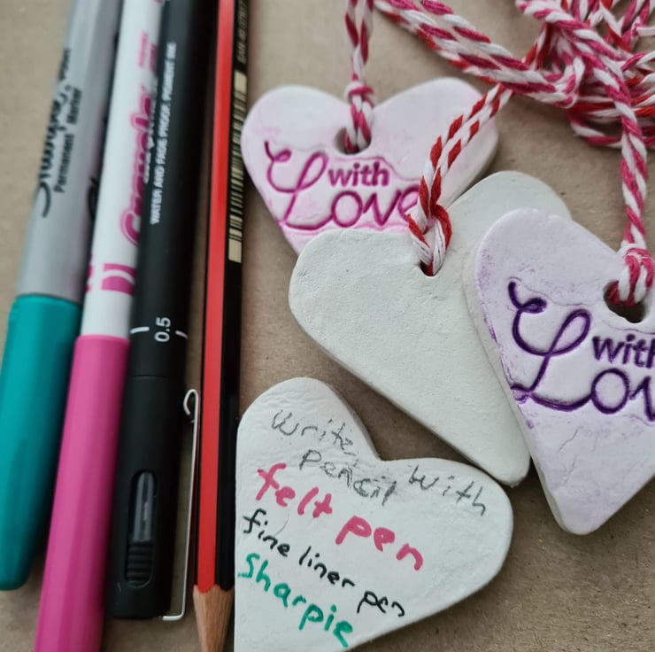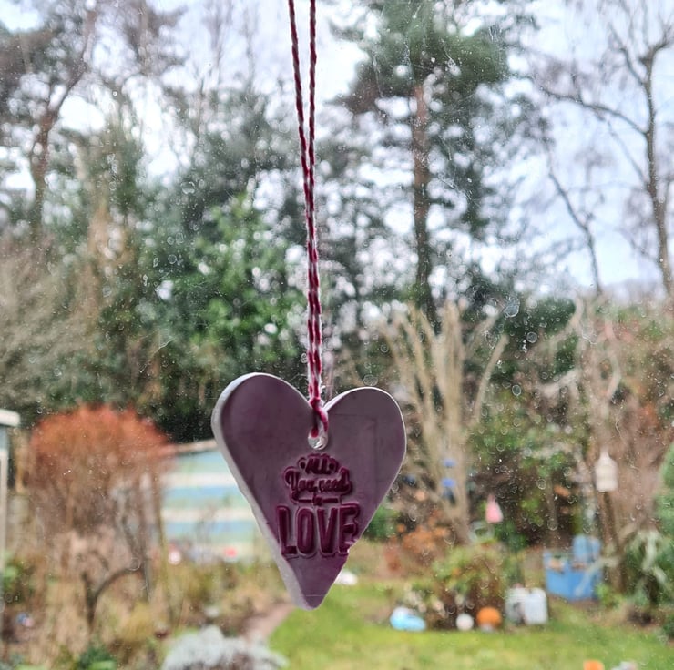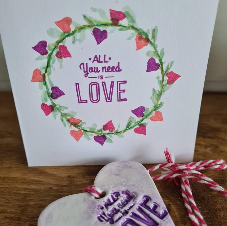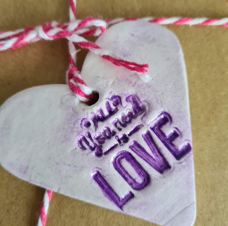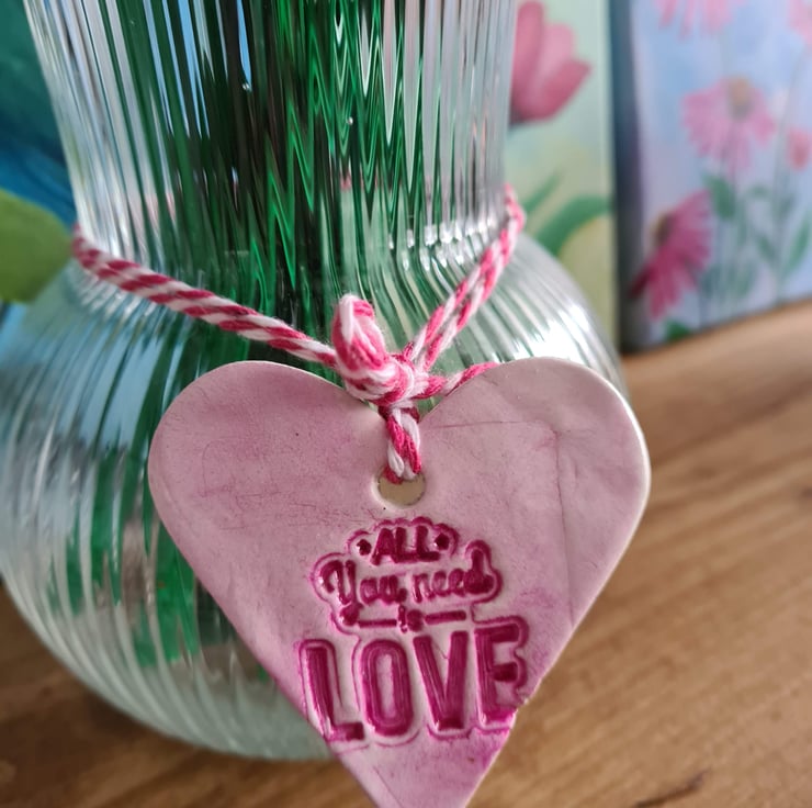 This pretty heart shaped hanging decoration is made from air-drying clay, which has been stamped with the words 'all you need is love' and given a colour wash to highlight the wording. Once dry, I gave it three layers of gloss varnish to give it a glazed ceramic look then attached baker's twine to finish. See 'Valentine's Day cards' collection for matching cards (also see photos).