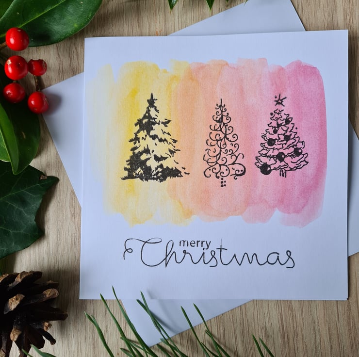This is a handpainted watercolour Christmas card with stamped Christmas trees, on quality card, with a pretty yellow/orange/red background.
