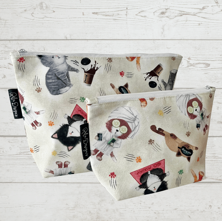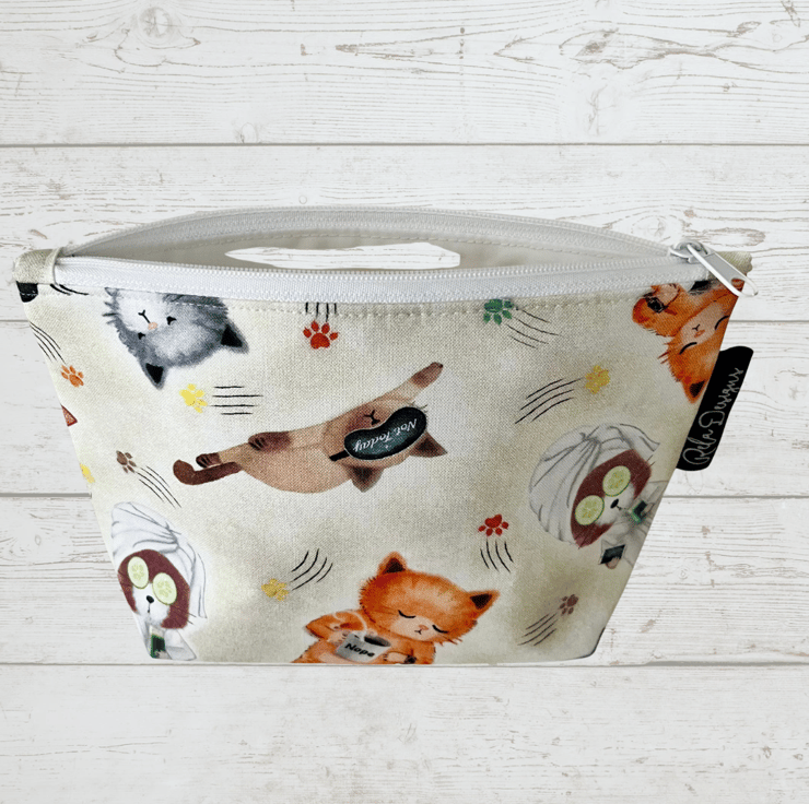 This pampered cat print cotton zipped pouch has a white waterproof nylon lining , great for those inevitable spills.