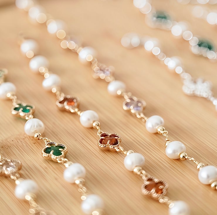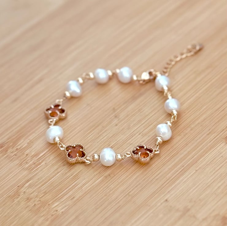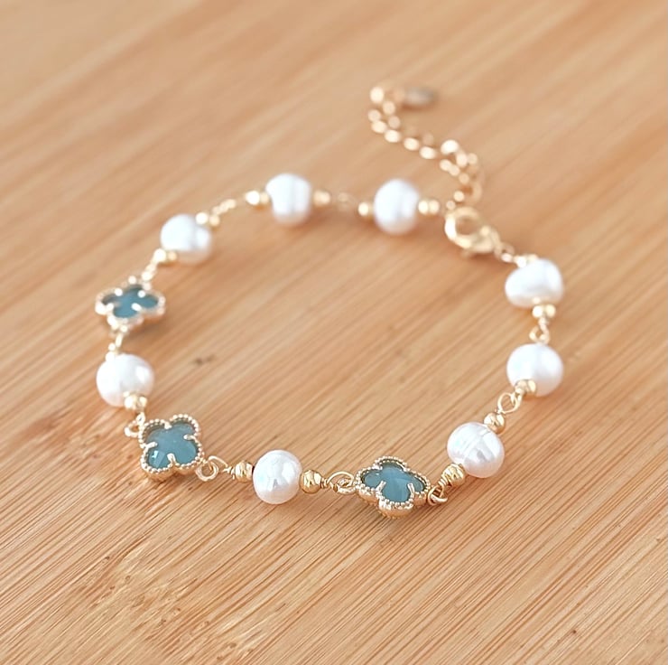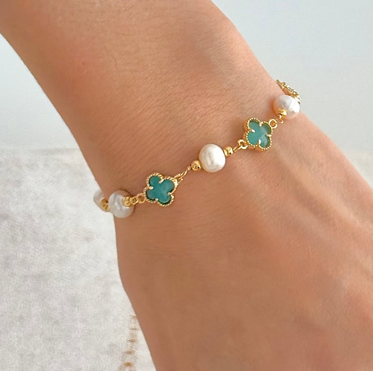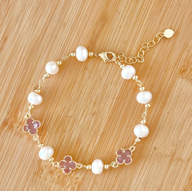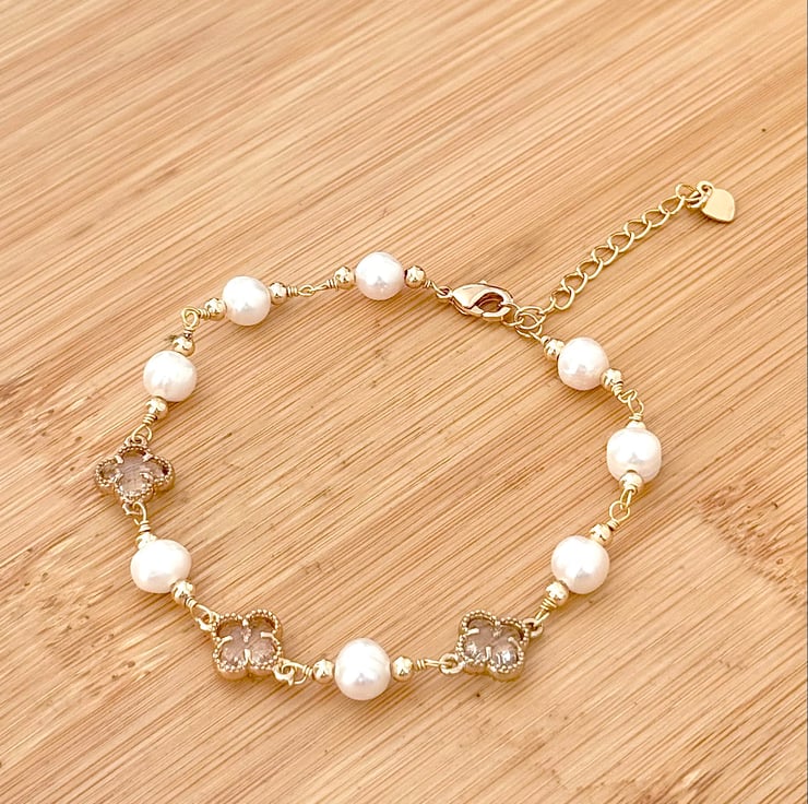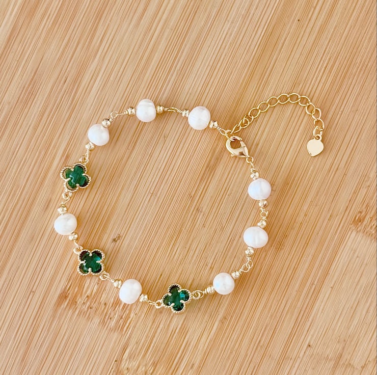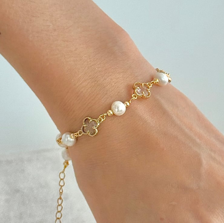 This elegant bracelet features lustrous freshwater pearls paired with delicate four-leaf clovers, symbolizing good luck. Crafted with gold-plated findings, it measures 7 inches in length, complemented by a 2-inch extension for adjustable wear. A perfect blend of sophistication and charm, ideal for any occasion.