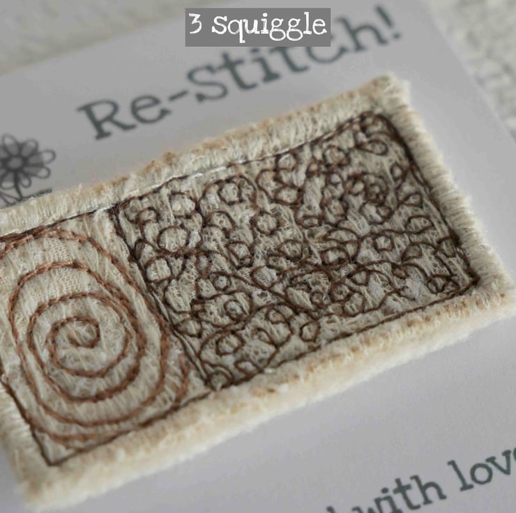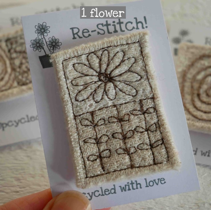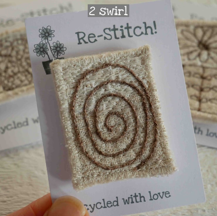 I love to doodle with my sewing machine! Here I chose to upcycle some cream fabrics and then scribble stitch each design simply to please myself! An upcycled wool backing and handstitched brooch pin finishes each piece.