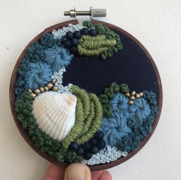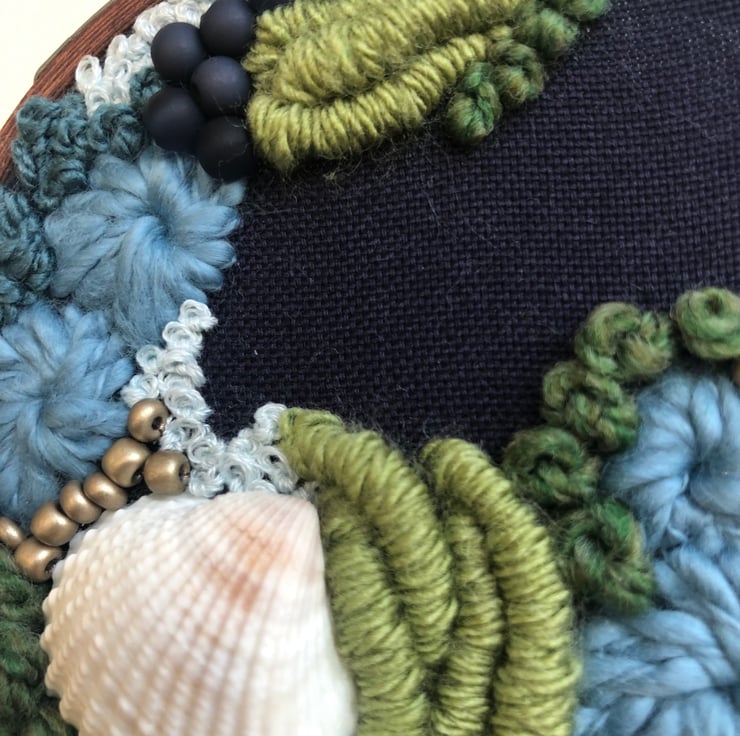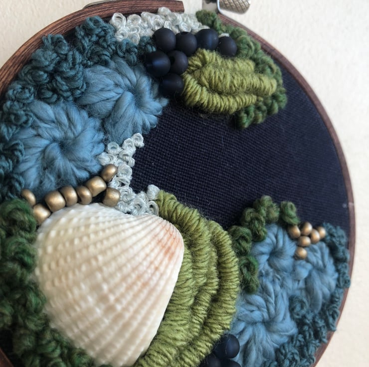 Sea pool a 4 inch one of a kind art piece. Embroidery thread, yarn, beads and shell have been hand stitched onto a dark blue fabric in an abstract pattern. The finished piece has then been placed in a hand stained dark wood hoop creating a piece of art which is both eye catching and unique.