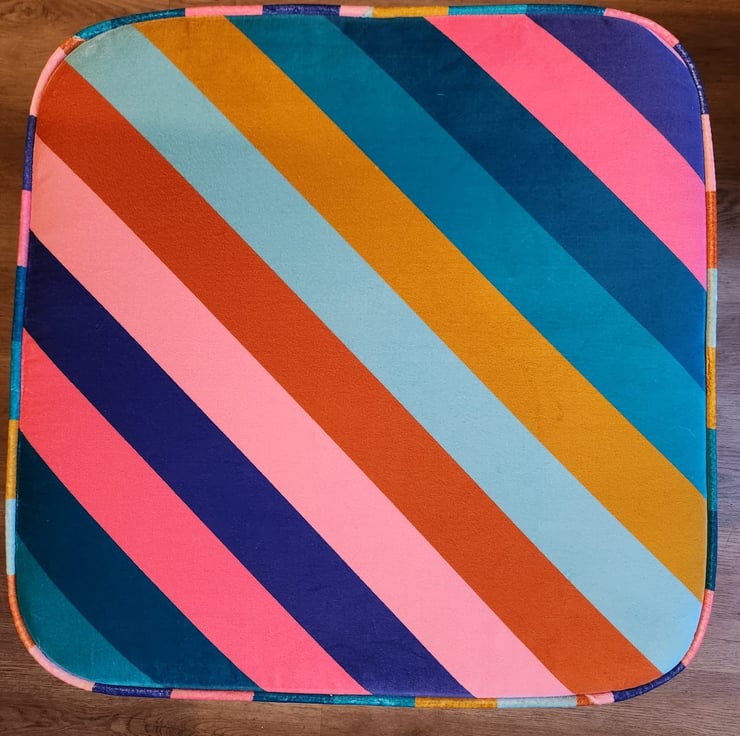 Pictured above is our Large size in ‘Harlequin Sherbet Stripe’ fabric with oak natural angled legs.