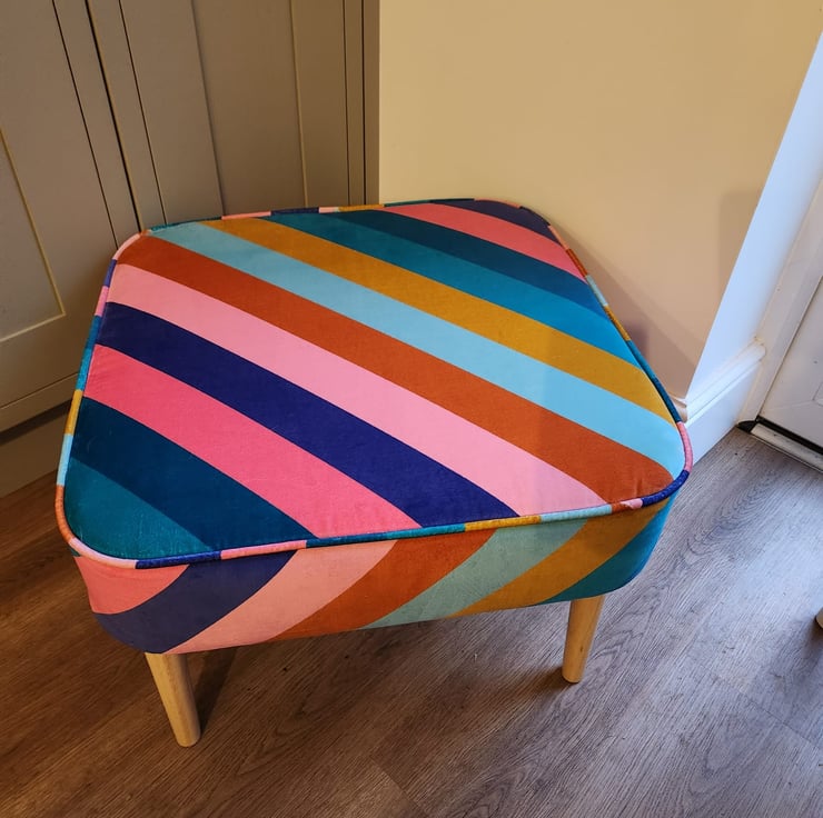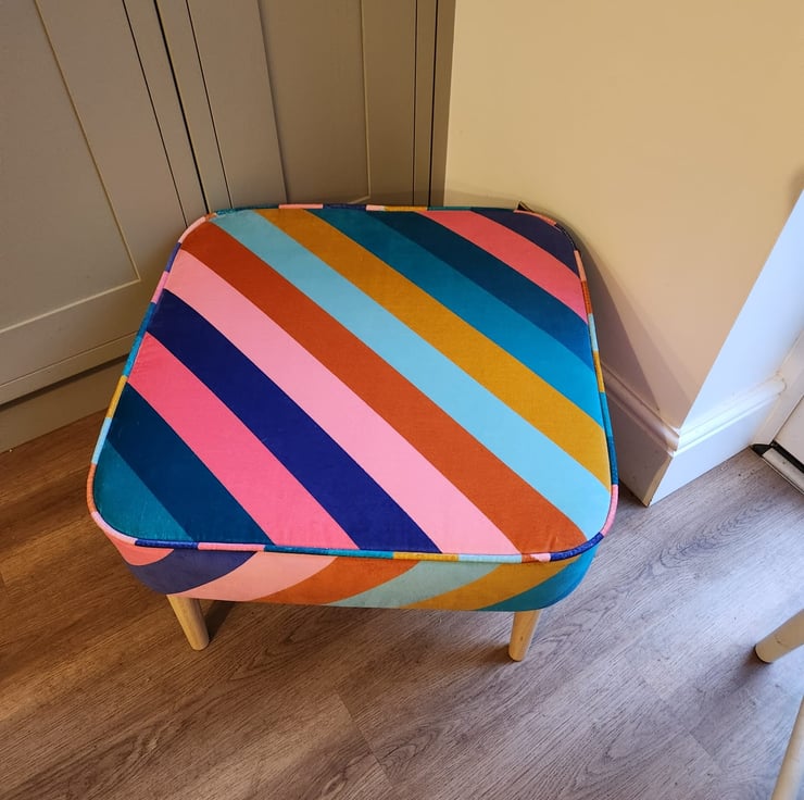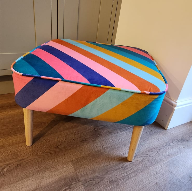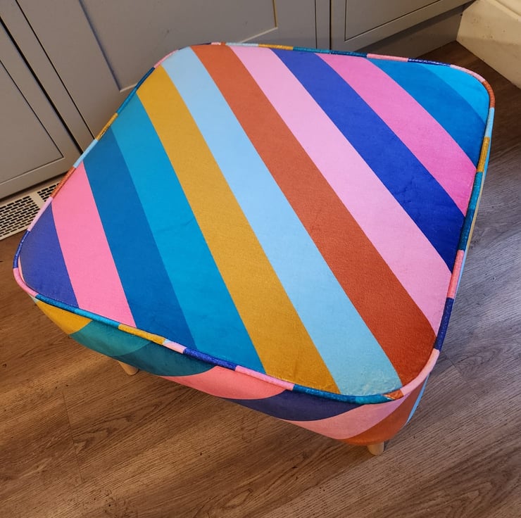 We are proud to offer a large footstool, upholstered in Harlequin Sherbet Stripe fabric.