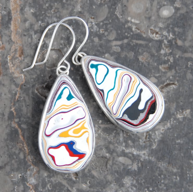These drop earrings feature fordite which has been bezel set in sterling silver and the earrings have been finished off with simple sterling silver hooks. The fordite was cut from the outside of the rough and still features some of the surface 'crust' dimples, they were cut as a sister pair so they don't match but the colour palette and patterning is consistent so they make sense as a pair. The fordite has a pattern of broad swirls (sort of camouflage pattern like) in yellow, silver and black on a white back ground. These fordite earrings measure approx 48mm from top of the hook to the bottom of the drop by approx 18mm wide. Comes in a gift box.