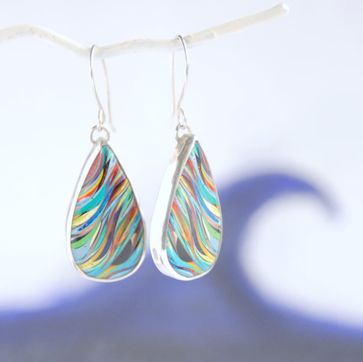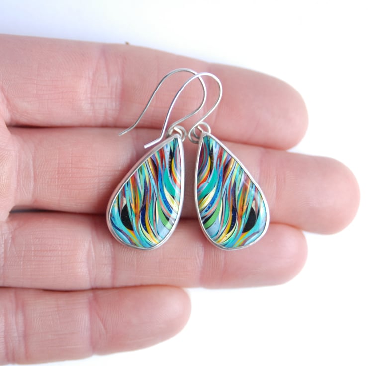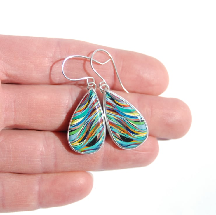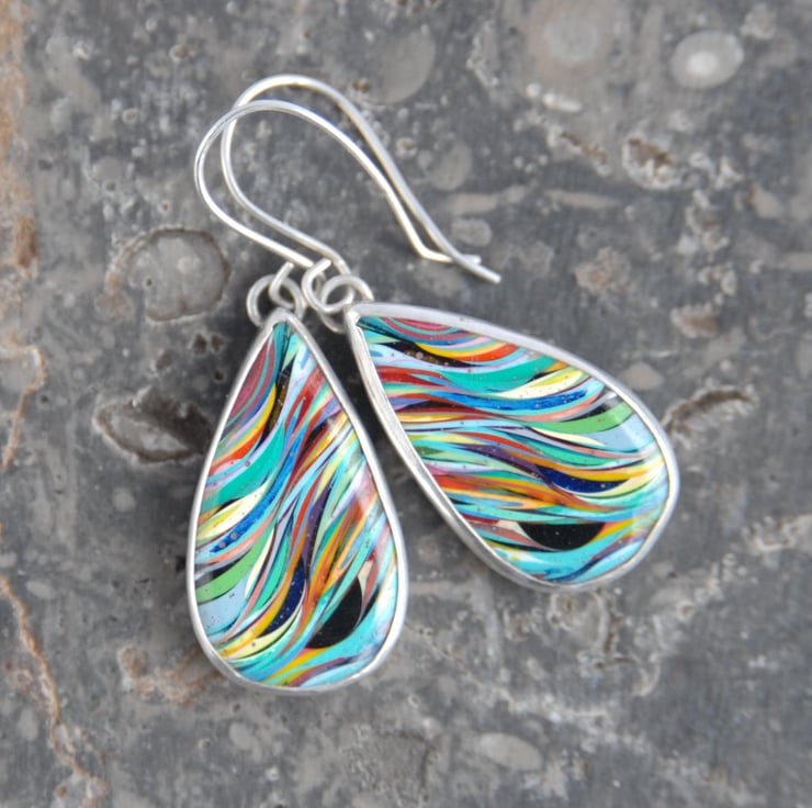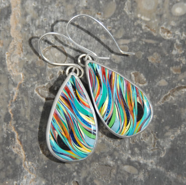 These colourful drop earrings have swirly surfite bezel set in sterling silver and have been finished with simple hooks (also sterling silver). The surfite has a particularly complicated pattern in many colours but predominately shades of blue and turquoise but there is an unusual black semi circle in there.The patternns are a mirror matched pair. Most of the colours are opaque but a few are translucent and allow light to shine through. The earrings measure 44mm from the top of the hook to the bottom of the earring by 16mm across. Perfect gift for anyone who loves the unusual or surfing.