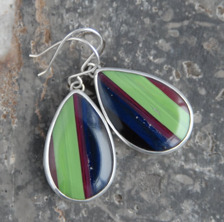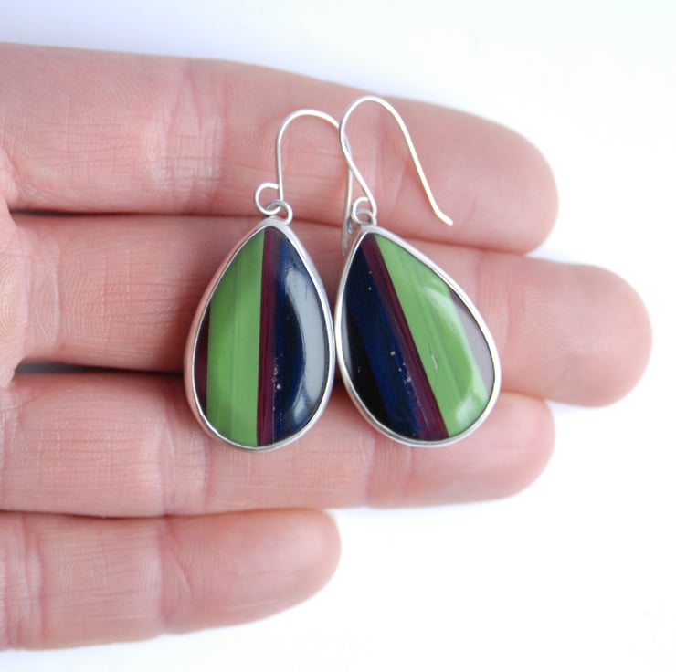 These muted earrings feature chunky drops of Cornish surfite which has been bezel set in sterling silver and finished off with a simple sterling silver hook. The surfite has broad vertical stripes of olive green, navy blue and maroon giving a more muted appearance compared to many of the surfite earrings I make. The drops are a mirror matched pair. These dangle earrings measure 45mm (from top of the hook) by 18mm across, surfite is lightweight so comfy to wear all day. Comes gift boxed.