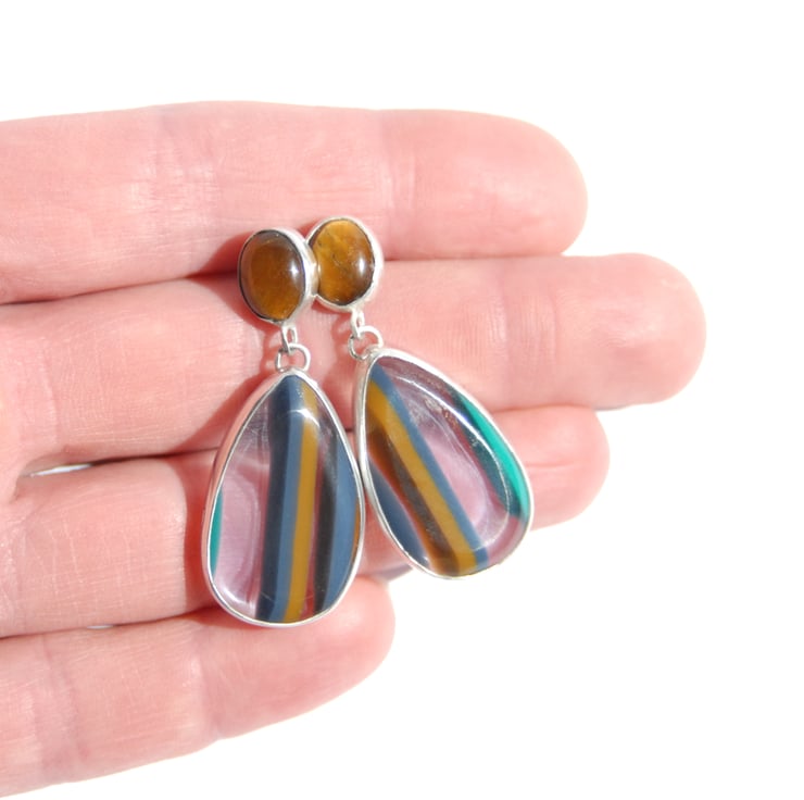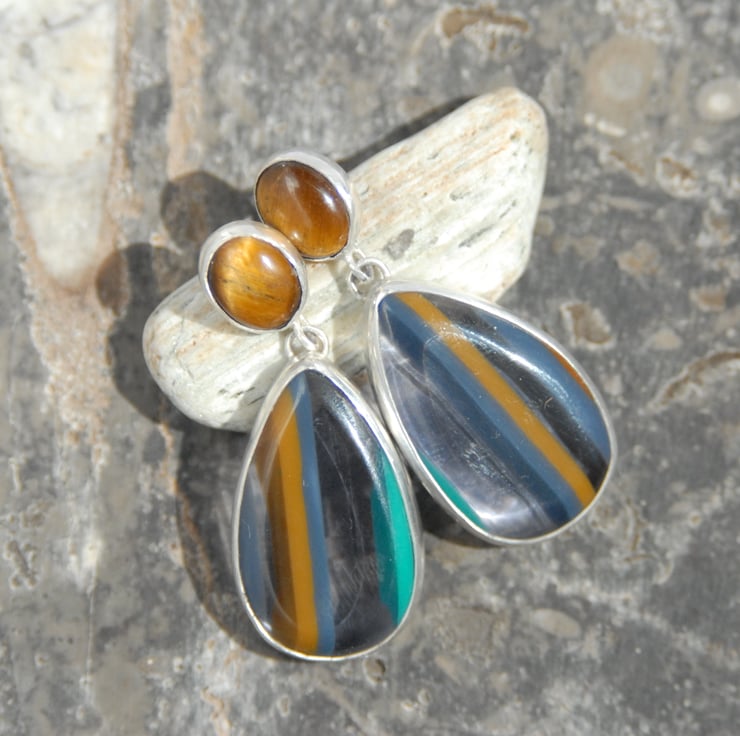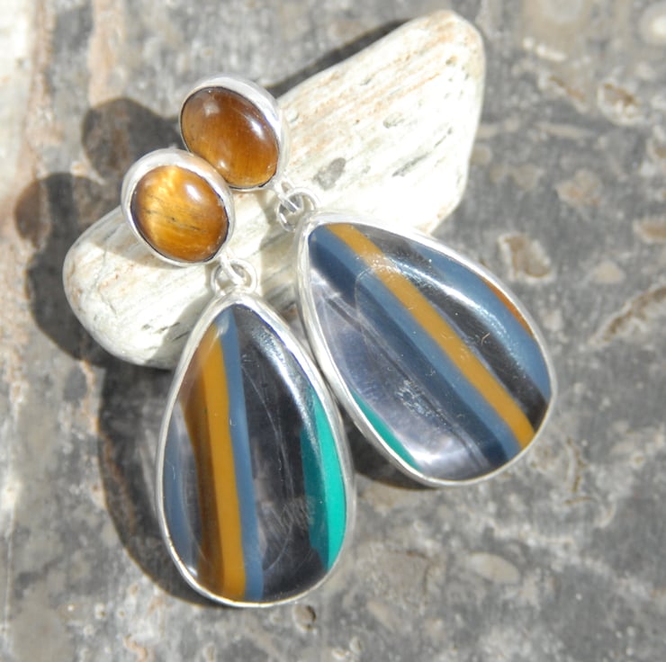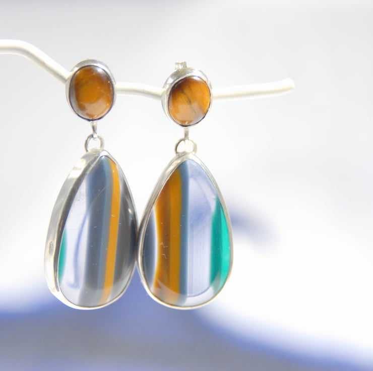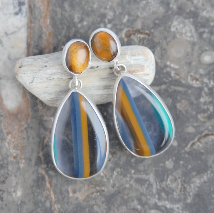 These muted drop earrings feature striped cabochons of upcycled surfite and oval tiger's eye which have been smoothly bezel set in sterling silver. The surfite has a striped pattern in grey, golden brown and clear with just a hint of green on one side, the golden brown matches well with the tiger's eye which is at the top of the earring hiding the post and scroll fitting. There is articulation between the stud top and main drop, the top section measures 9 x7mm diameter whilst the bottom drop is 27mm by 17mm, total drop is approx 42mm.