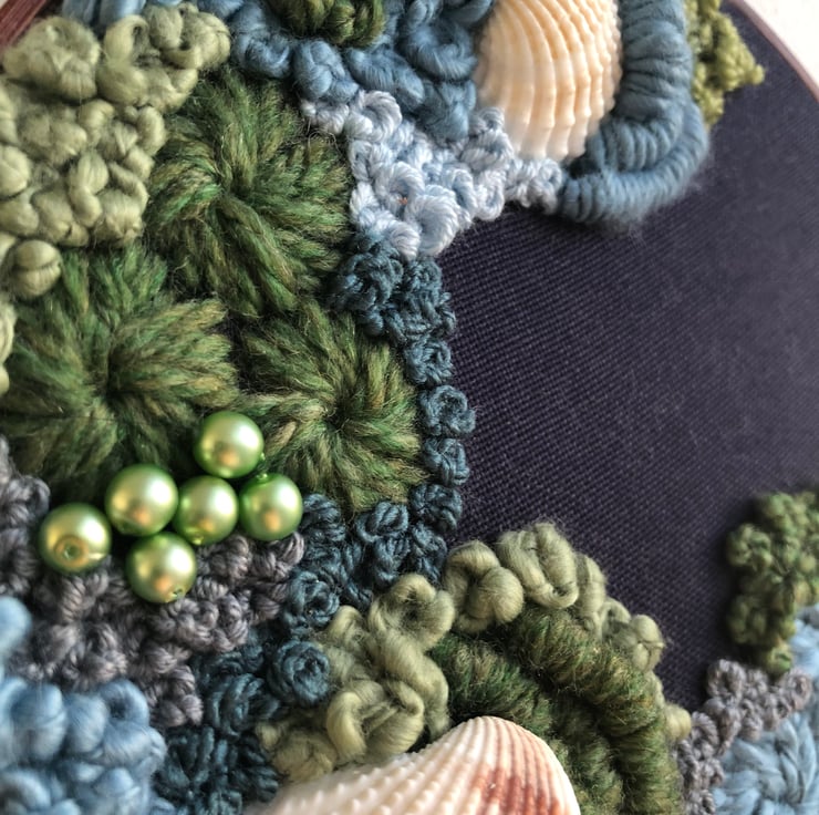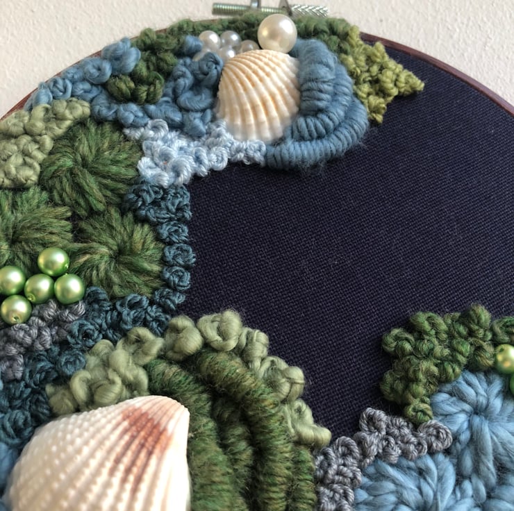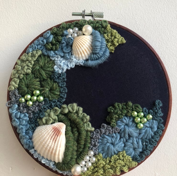 Beyond the sea a 6 inch one of a kind art piece. Embroidery thread, yarn, beads and shell have been hand stitched onto a dark blue fabric in an abstract pattern. The finished piece has then been placed in a hand stained dark wood hoop. This has created a piece which is both eye catching and unique the perfect addition to any home.