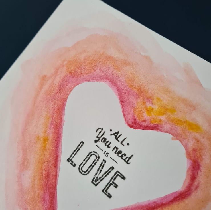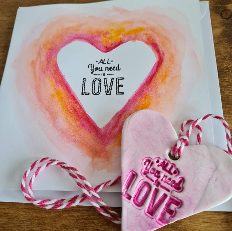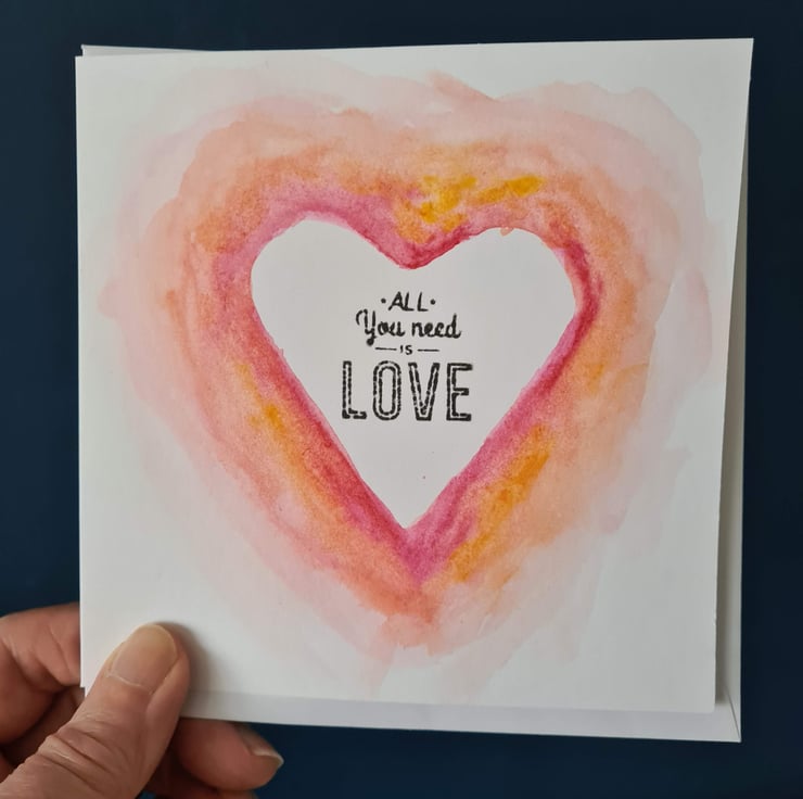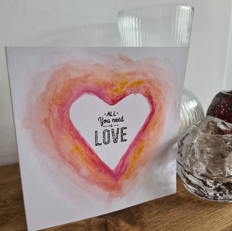 This is a handpainted watercolour card on quality card, which can be used for Valentine's Day, anniversary, engagement or just sending love to someone! Also available is a matching clay hanging decoration/gift tag embossed with the words 'all you need is love' - see 'Clay hanging decorations' collection or 'Valentine's Day cards and tags' collection.