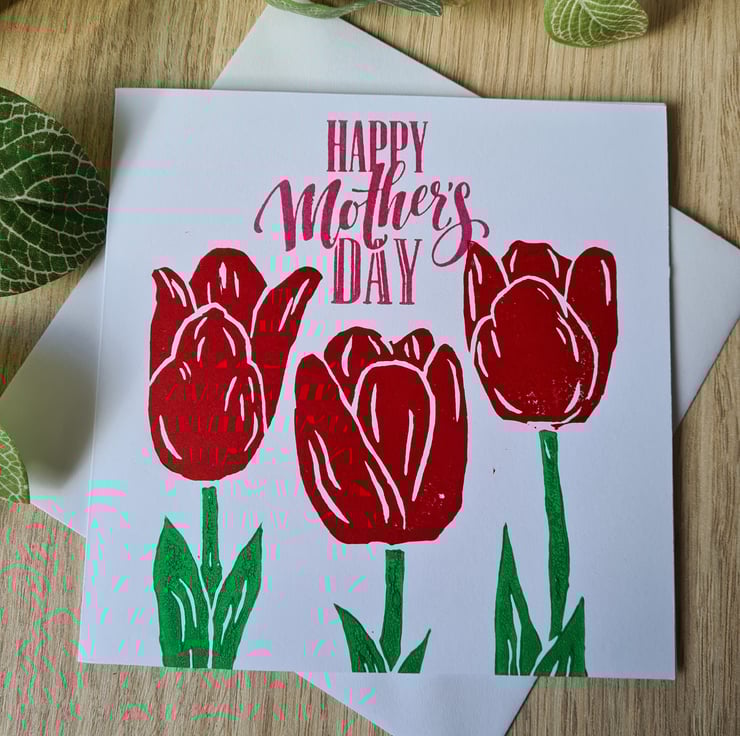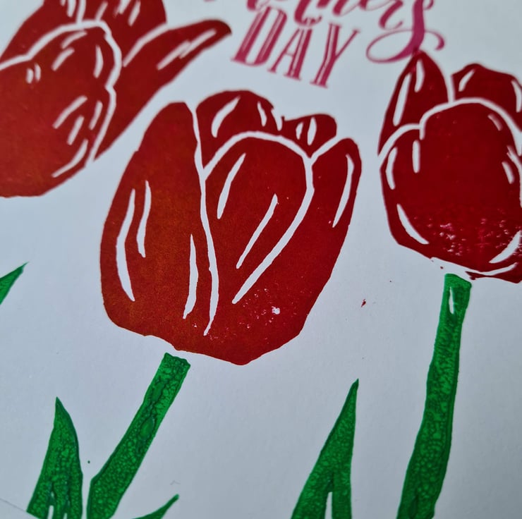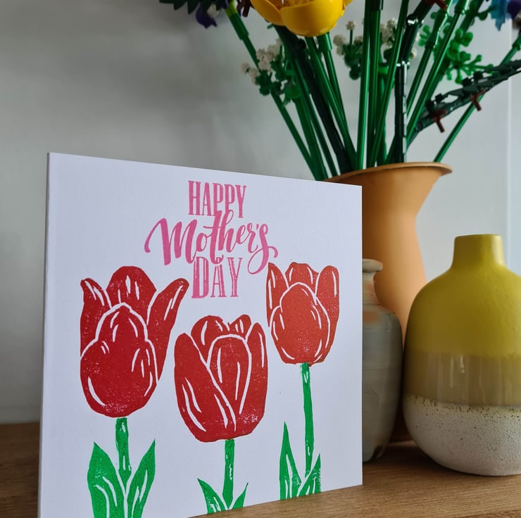 This Mother's Day card is handprinted from my own carved linocuts using quality printing inks and stamped text to create a lovely colourful design.