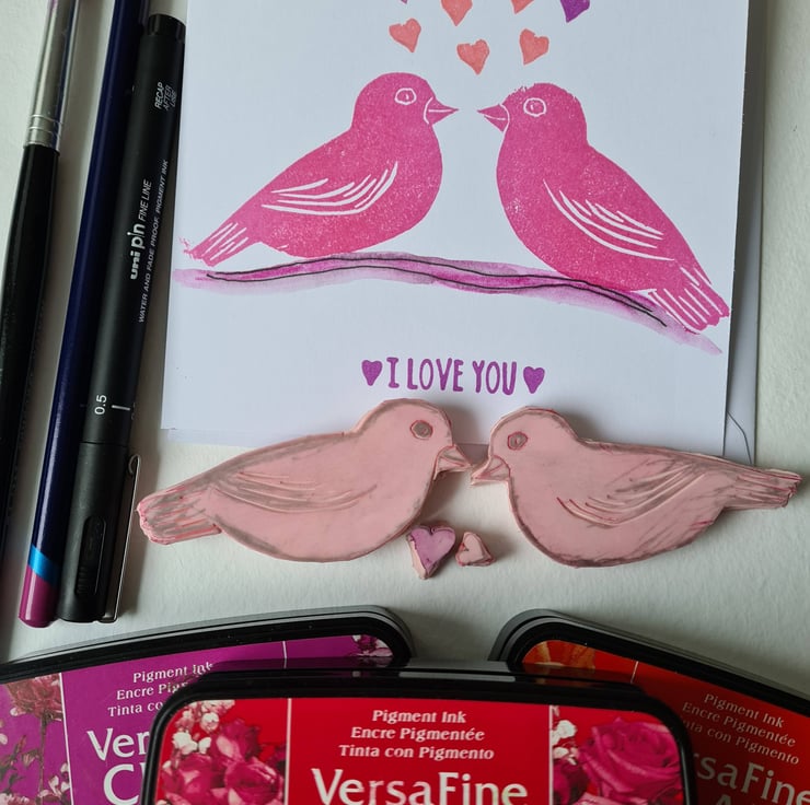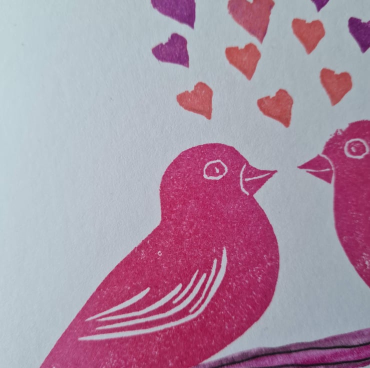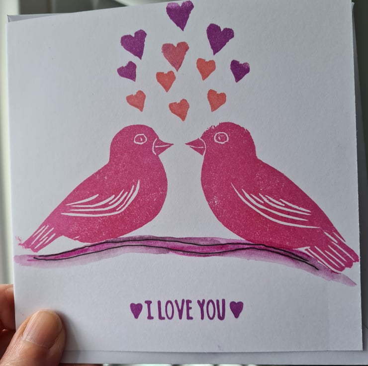 This card is handprinted from my own carved stamps, of two lovebirds on a branch which is painted in watercolour and finished with fineliner pen. The card could be for Valentine's Day, anniversary, engagement, to give to your partner on your wedding day or just sending love! There are heart shaped valentines themed clay hanging decorations/gift tags also available - see 'Clay hanging decorations' collection or 'Valentine's Day cards and tags' collection. These can be used for tying round a gift or bouquet of flowers to go with the card.