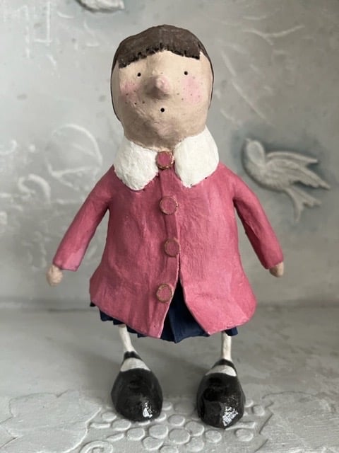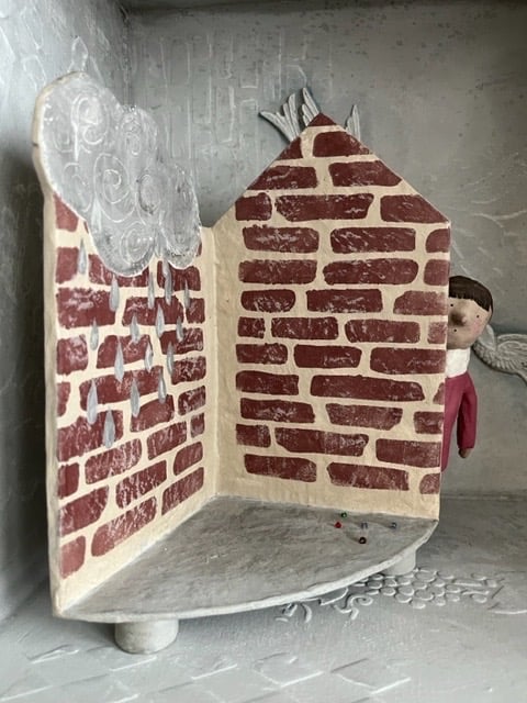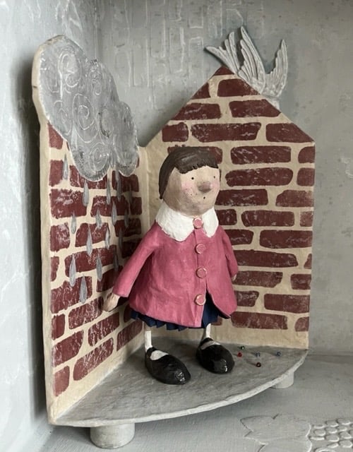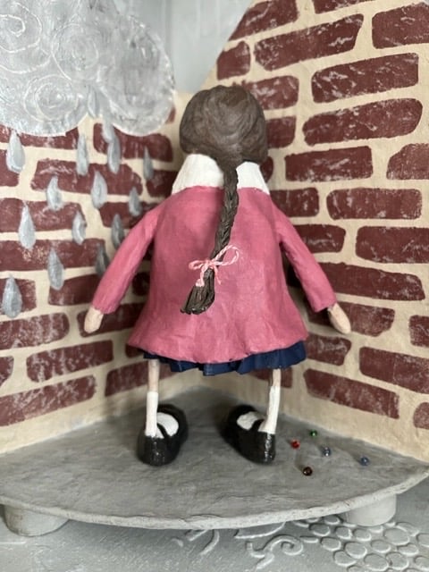 This little girl sculpture wears her favourite pink coat with faux fur collar and black leather patent shoes. Her plaited hair is styled with florist wire then covered in thin layers of paper. The platform is made of cardboard and represents a school playground on a rainy day; the glass seed beads represent marbles (her favourite game). All elements of this assemblage piece are finished with chalk paint and wax.