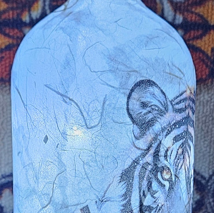 Decoupaged glass (thick, heavy glass), 9.5 inches tall. 4 inches wide. Fitted with cold white LED lights, battery operated.