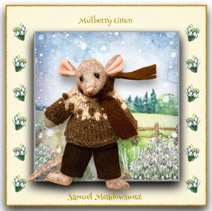 Samuel Meadowsweet, dressed in his brown and cream yoked jumper, matching scarf and brown corduroy trousers, is one of the Little Nippers - tiny mice who live in a maze of tunnels underneath the barn at Mulberry Farm. All of the Little Nippers are named after herbs and meadow flowers. The Little Nippers are 14cm tall. Clothes made especially to fit them are also available in my shop.