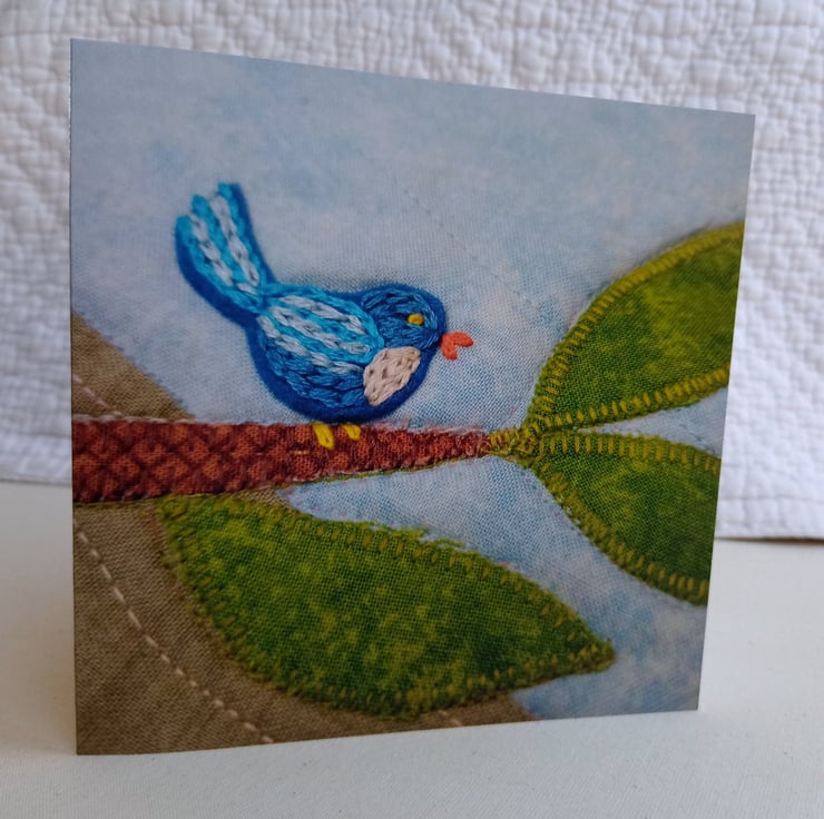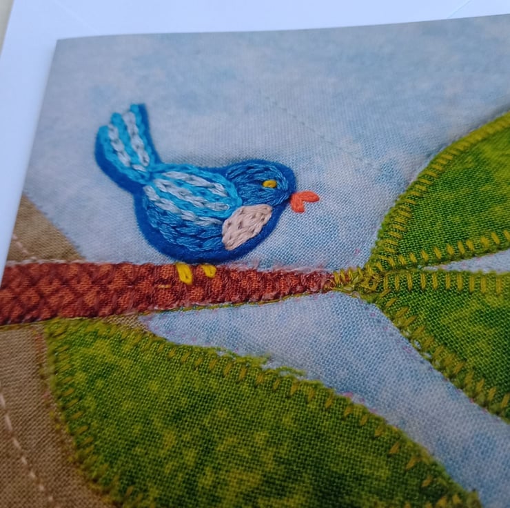 Blue bird in a tree - this lovely greetings or occasions card has been printed with a small detail from one of my appliqued and embroidered quilts. Blank inside for your own message, I think this card would appeal to all ages and is ideal for any occasion.