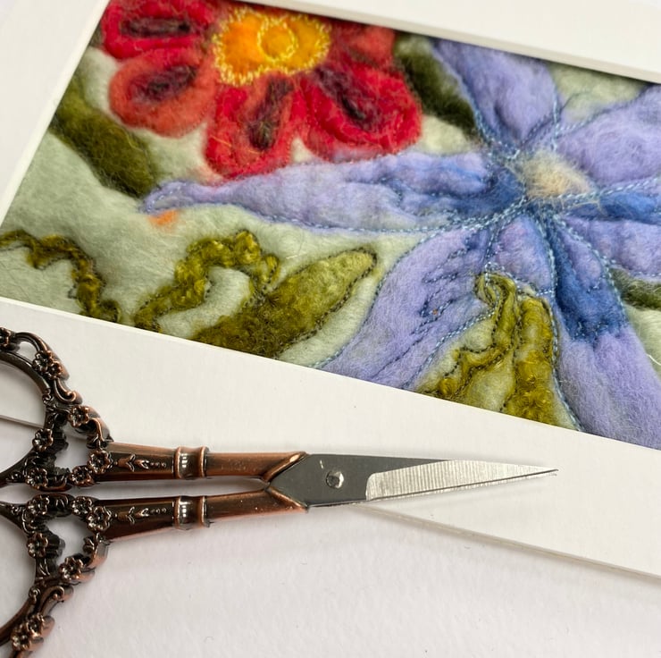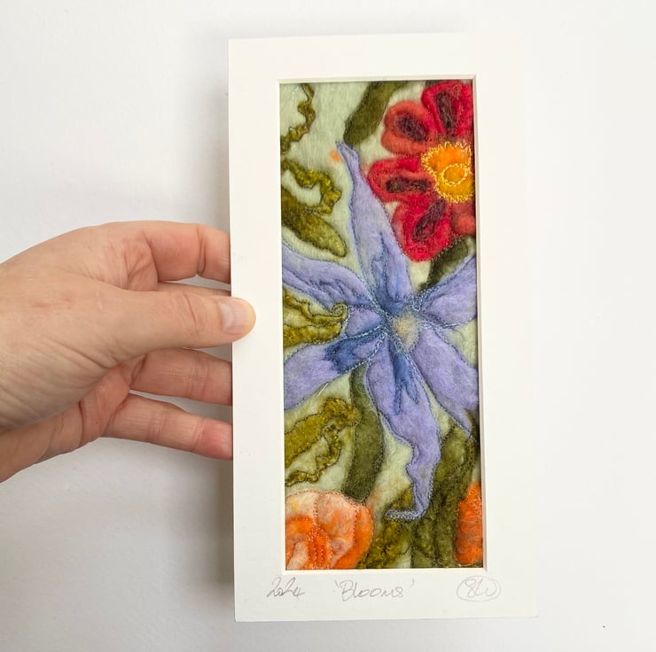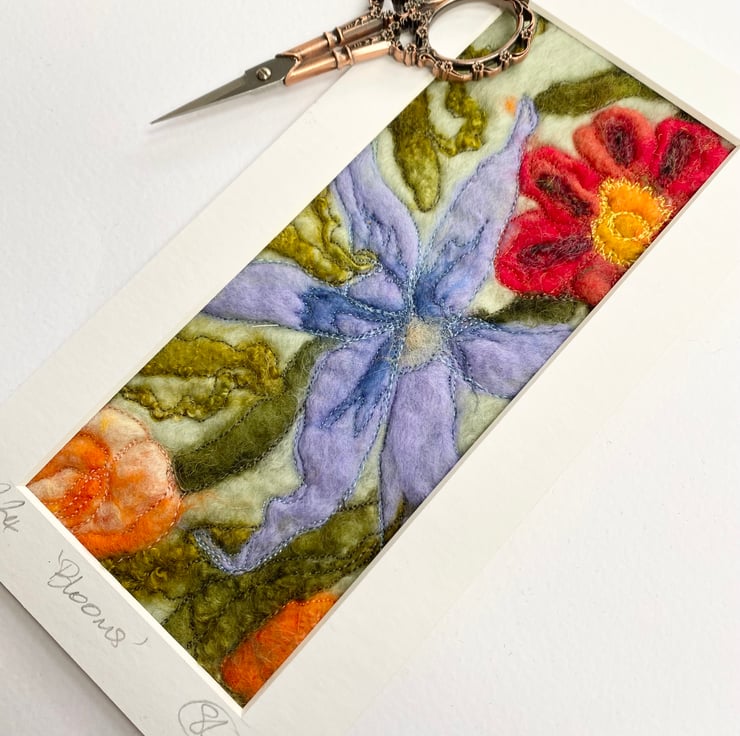 This sweet piece shows a close up of various flowers. It’s an original wet felting that’s been embellished with up-cycled fabrics and free motion embroidery.