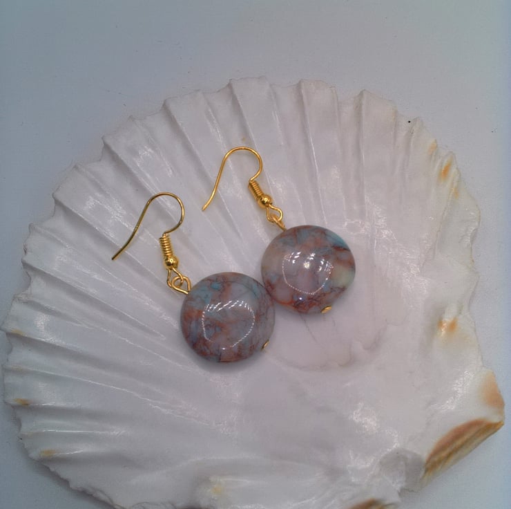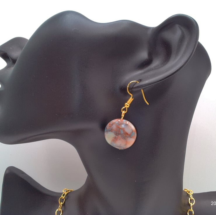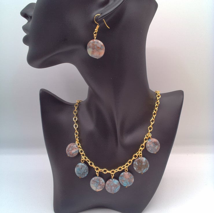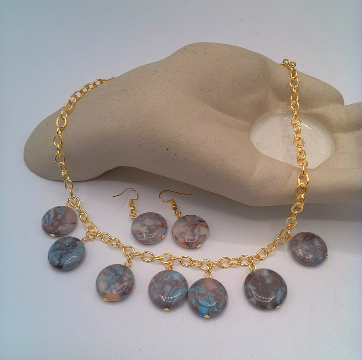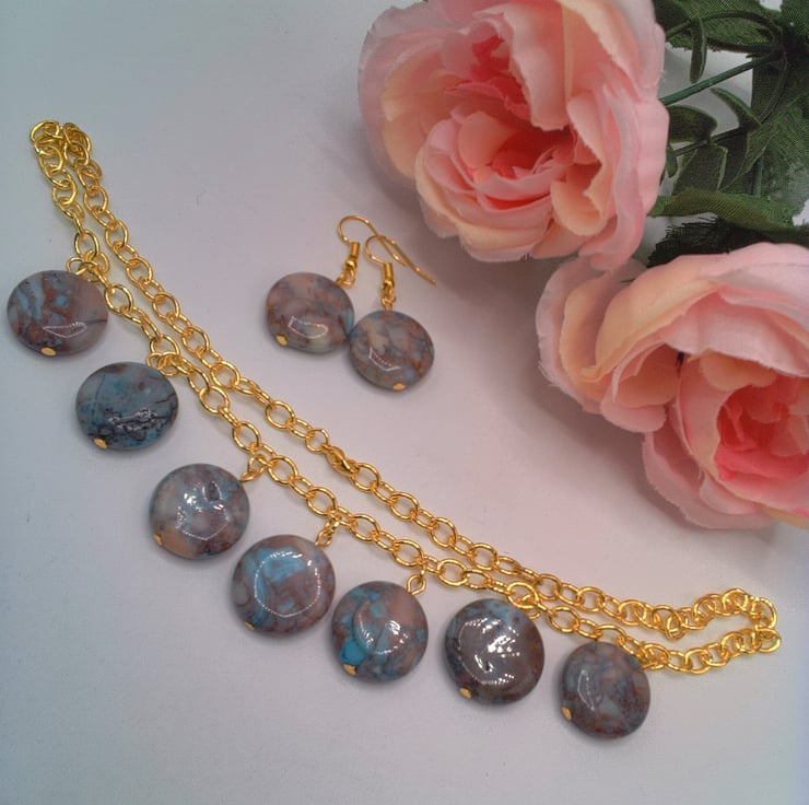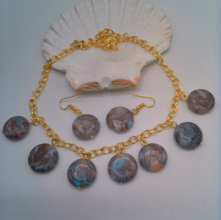 This classic design turquoise and pink agate jewellery set comprises a necklace and a pair of earrings. The necklace is made using seven 18 mm round turquoise and pink agate beads suspended on a gold plated chain using gold plated jump rings. The earrings are made using one of the round turquoise and pink agate beads suspended on gold plated hook ear wires. The necklace is fastened with a gold plated lobster clasp and it measures 17 inches (43 cm) with a drop of 0.75 inches (2 cm ) from the chain for each of the round agate beads. The earrings have a drop of 0.75 inch (2 cm) drop from the base of the ear wire. This very pretty set would look great with an outfit for everyday wear or as a gift for someone special. It will be dispatched wrapped in tissue paper in an organza bag and be delivered to you via Royal Mail first class post.
