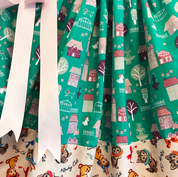 A full skirt with a free size waist band. It pulls in on the waist or the hips with the pale pink satin ribbon and opens out wide to just under 2 meters.